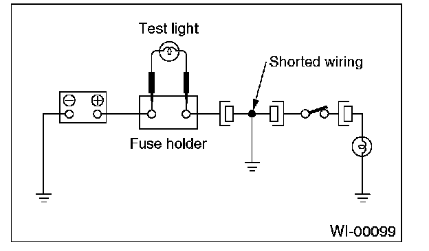 Connect a test light (rated at approx. 3 watts) in place of the blown fuse and allow current to flow through the circuit. Disconnect one connector at a time from the circuit. Starting with the one located farthest from the power supply. If the test light goes out when a connector is disconnected, the wiring between that connector and the next connector (farther from the power supply) is shorted.
