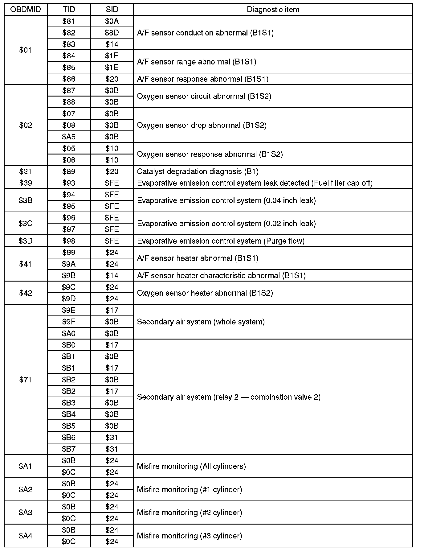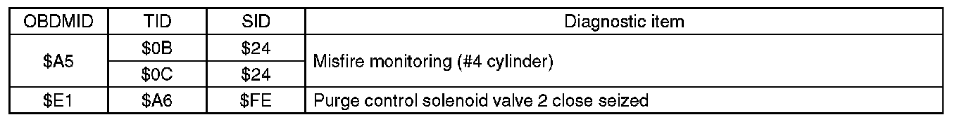 A list of the support data and PID (Parameter Identification) codes are shown in the following table.