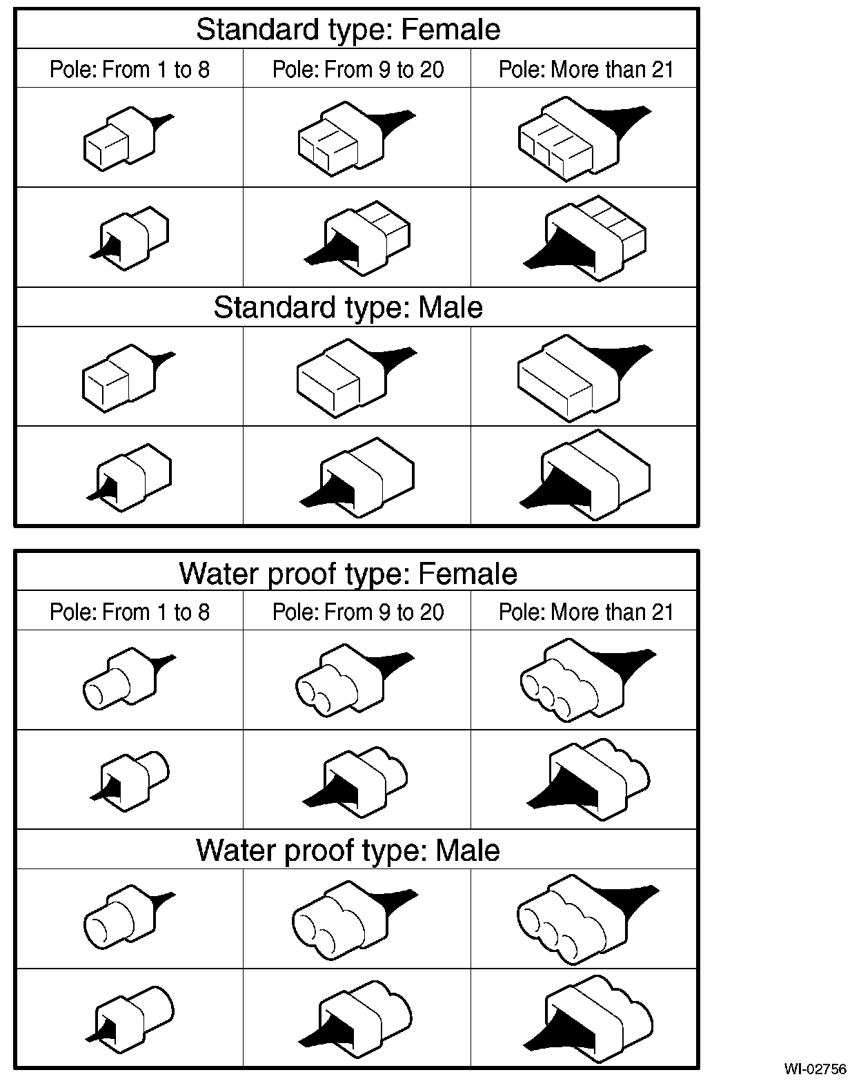 A number of connector symbols are used in each wiring diagram to easily identify the wiring harness connectors.