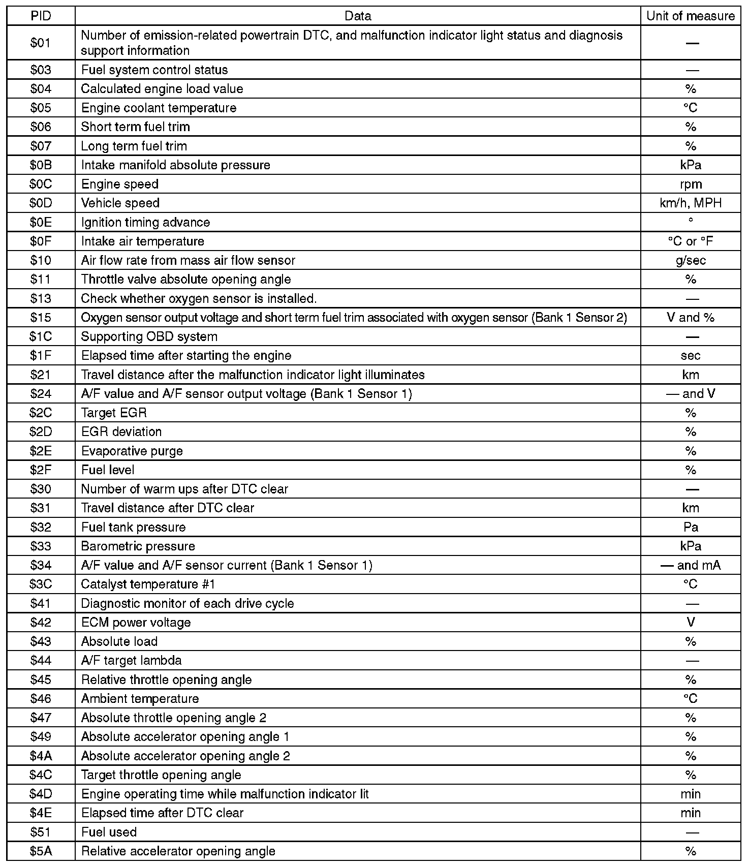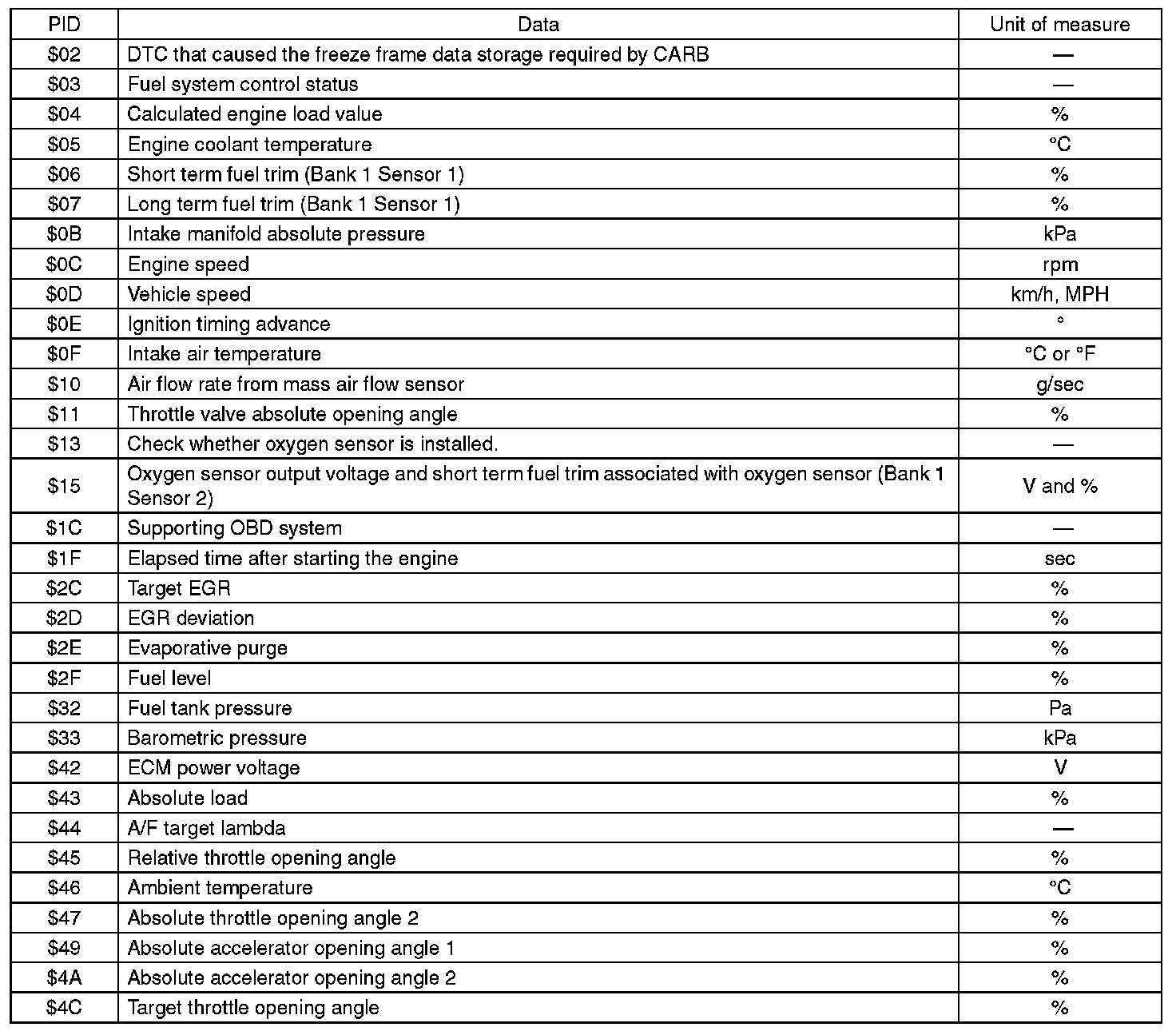 A list of the support data and PID (Parameter Identification) codes are shown in the following table.