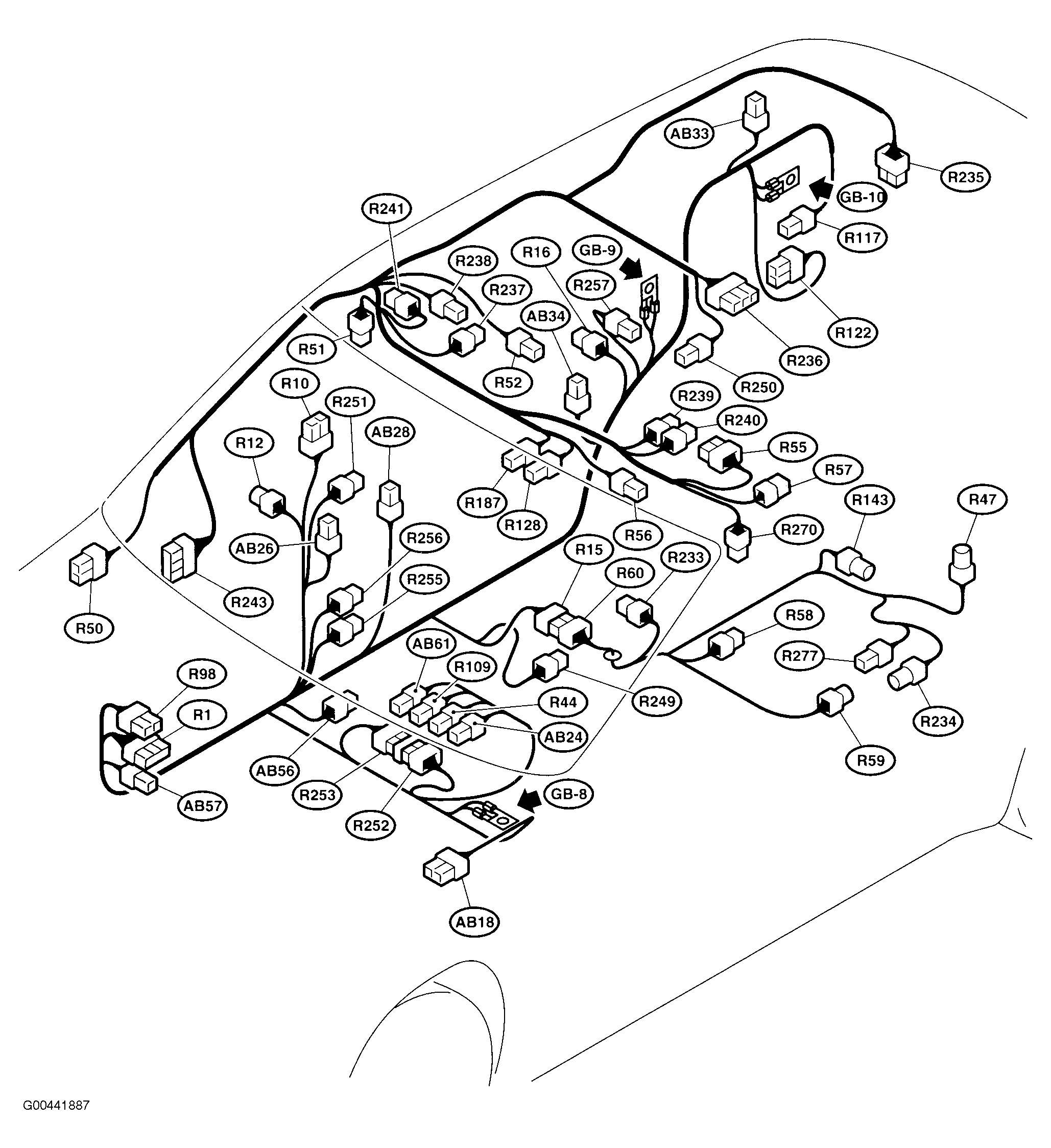 | Fuel Pump Control Unit (R122) | At right "D" pillar. See Figure. |