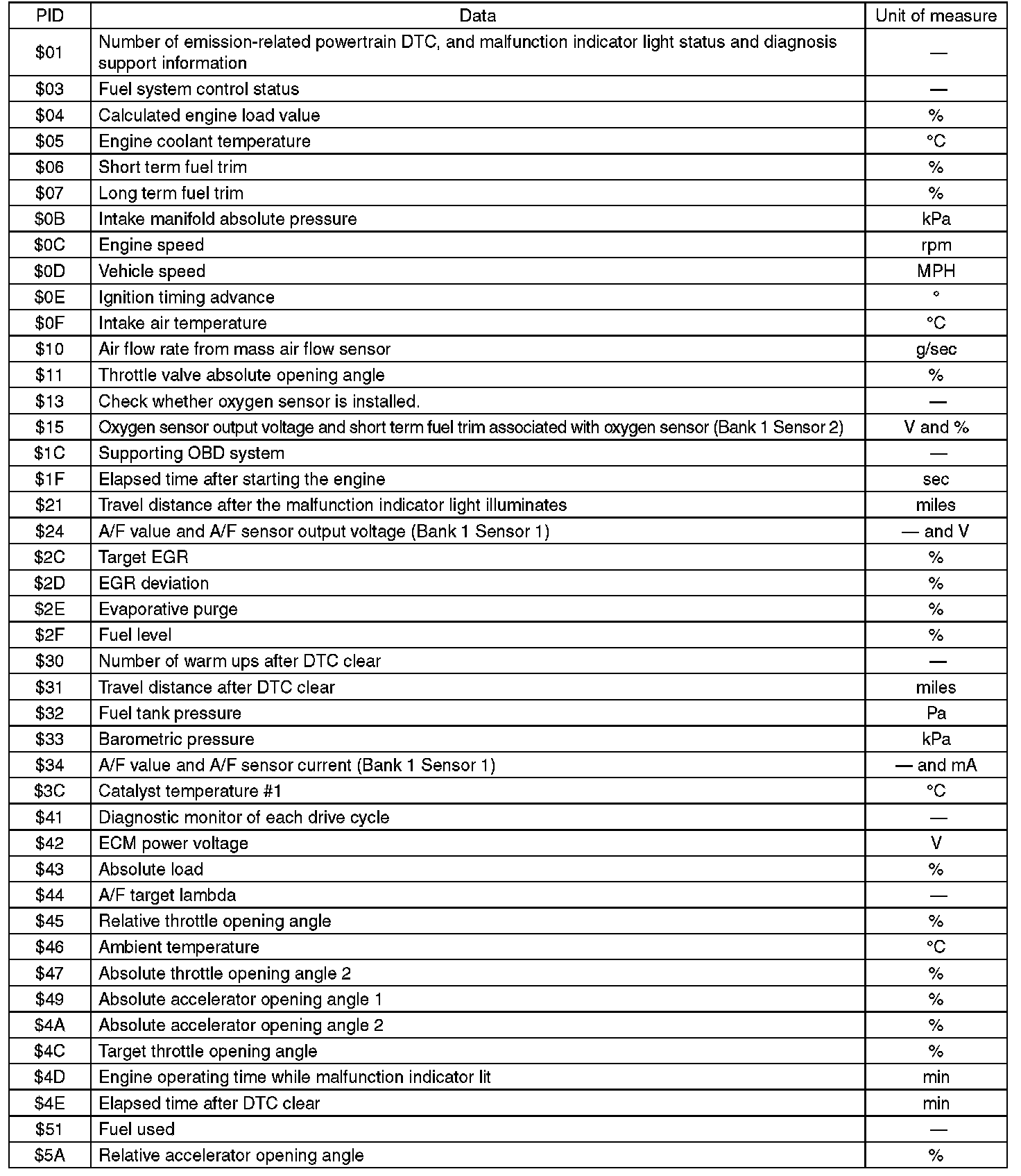 A list of the support data and PID (Parameter Identification) codes are shown in the following table.