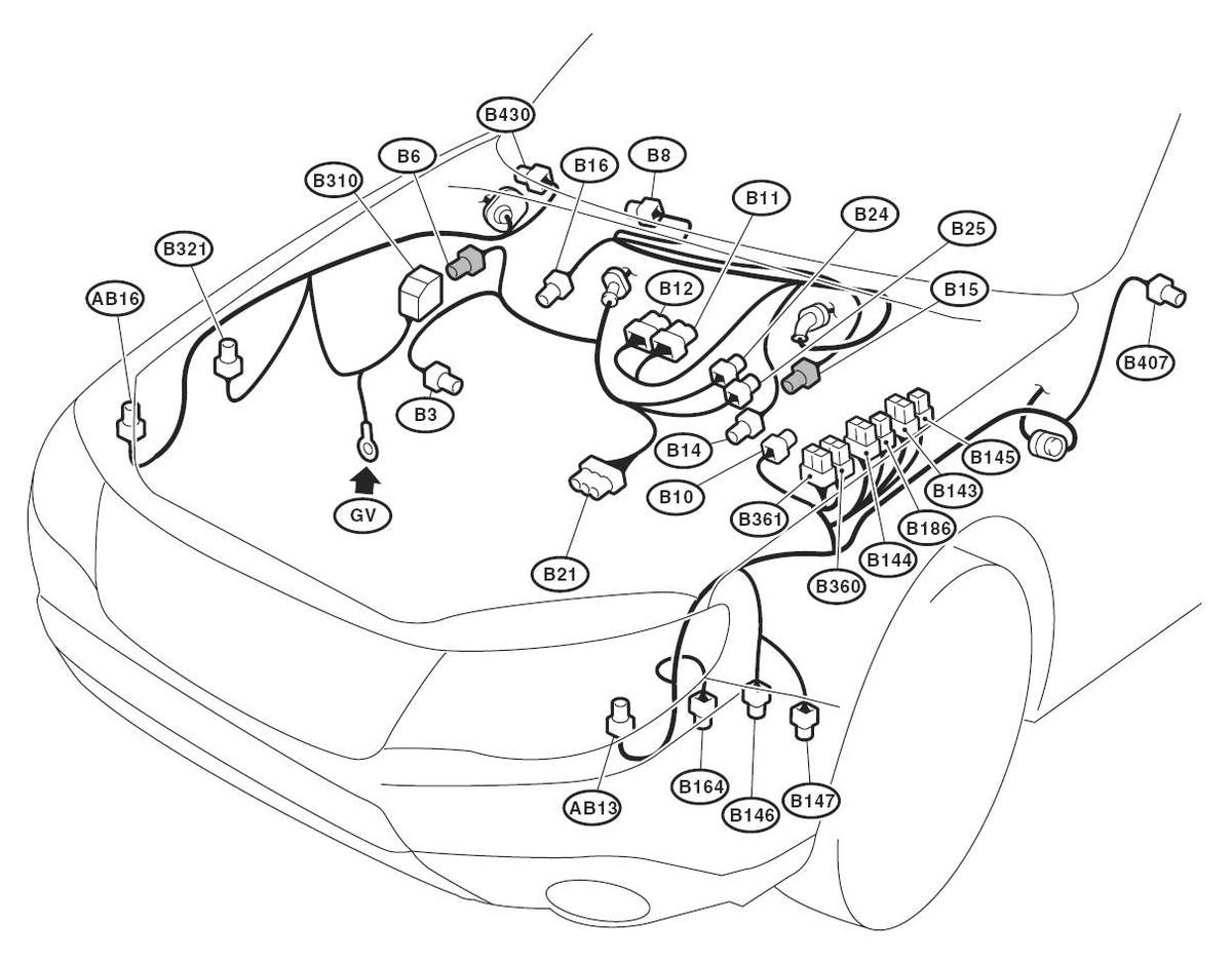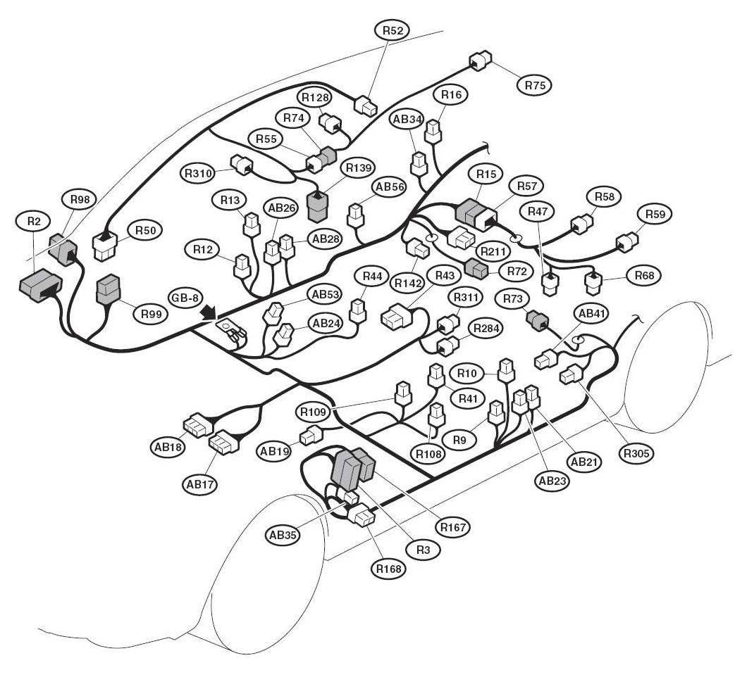 | Engine Control Module (B134, B135, B136 & B137) | In passenger side front footwell below carpet and protective panel. See Figure. |