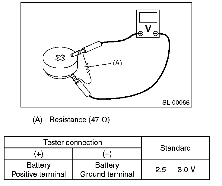 Measure the voltage between the keyless transmitter battery (+) terminal and (-) terminal.