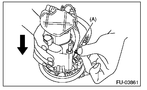 6. Push to compress the fuel filter assembly in the direction of the arrow, remove clip (A), and separate the sub tank bracket assembly and the fuel filter assembly.