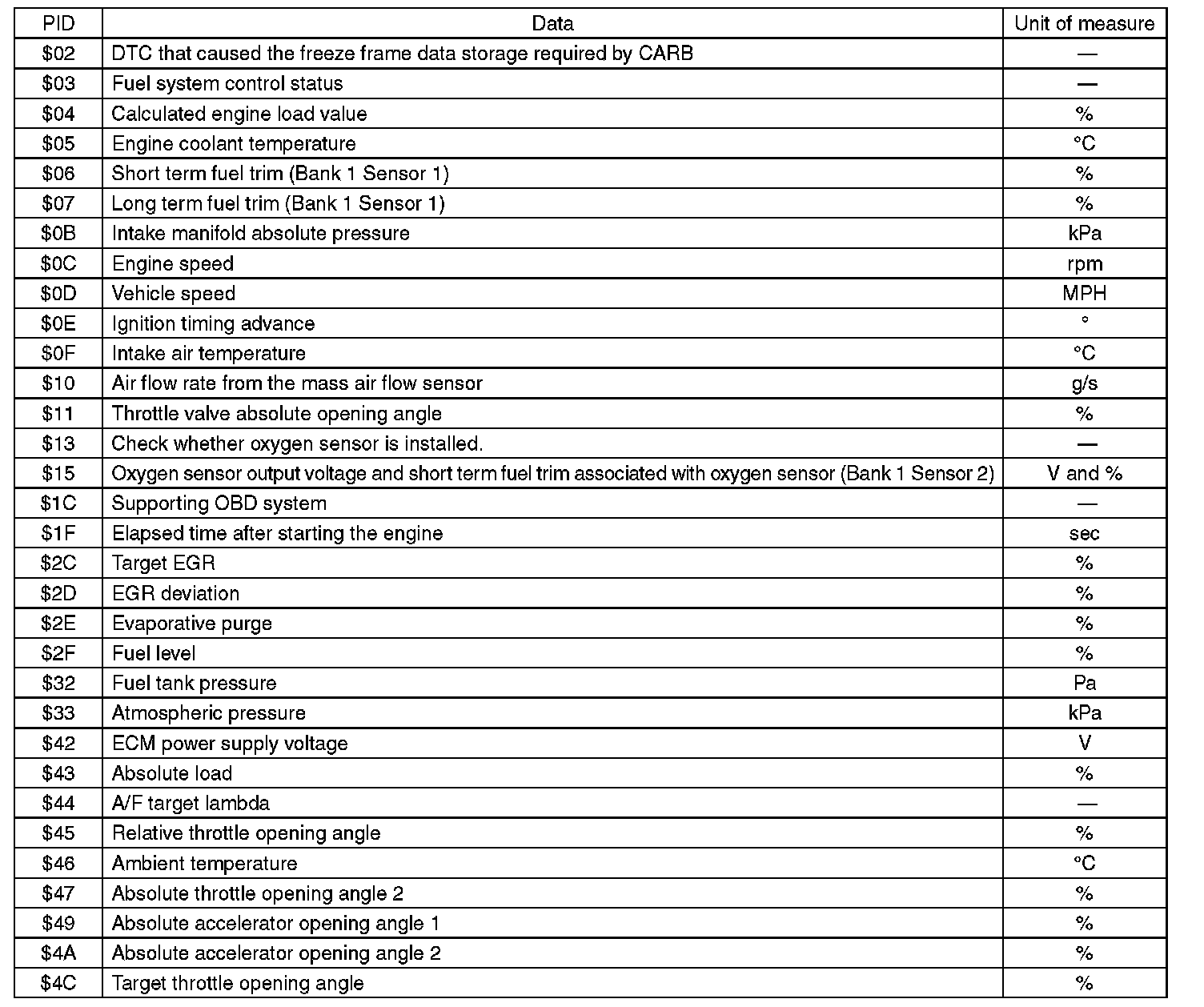 A list of the support data and PID (Parameter Identification) codes are shown in the following table.
