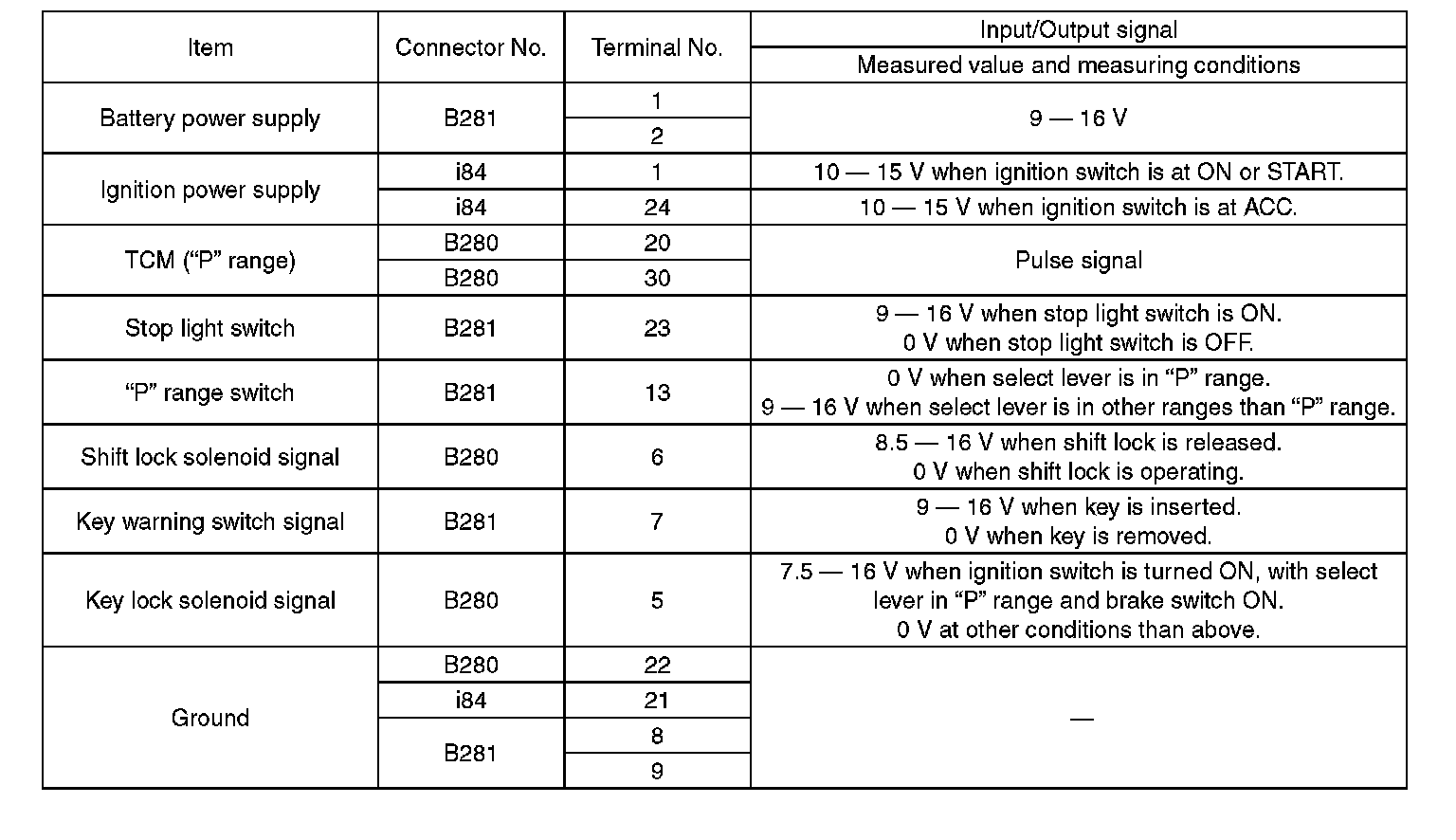 Pinout Values and Diagnostic Parameters