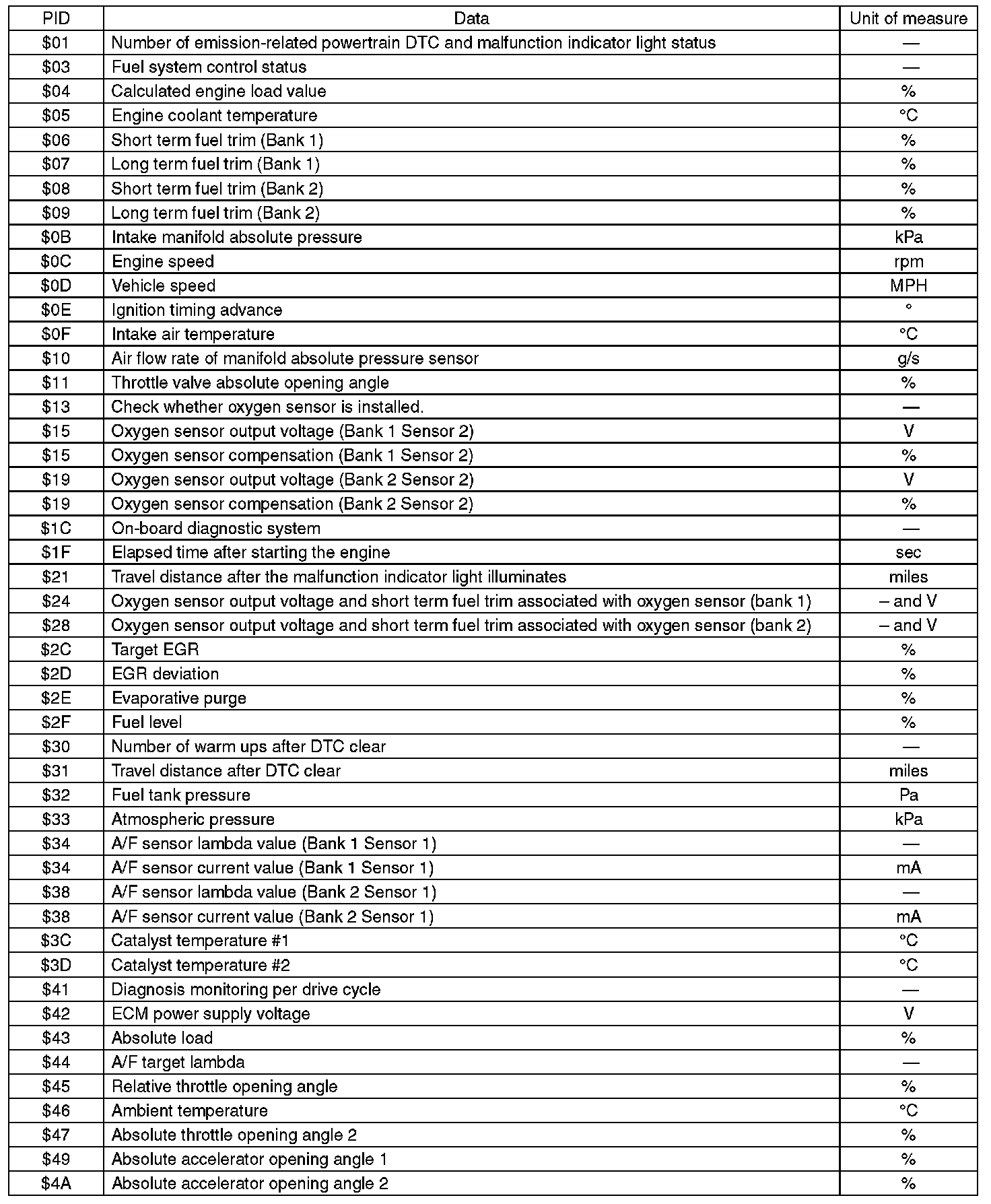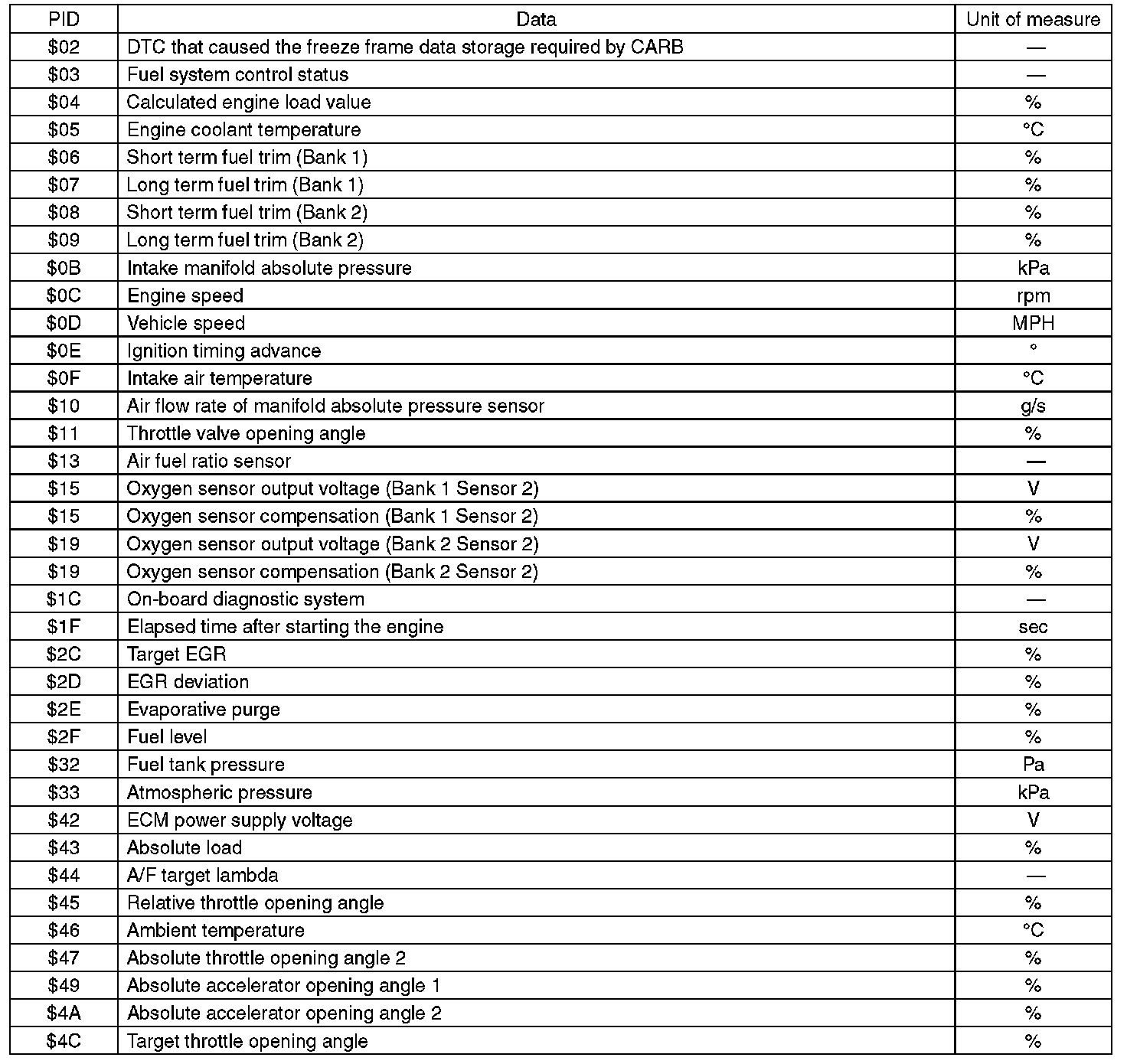 Refer to data denoting the operating condition when trouble is sensed by the on-board diagnosis system. A list of the support data and PID (Parameter Identification) codes are shown in the following table.