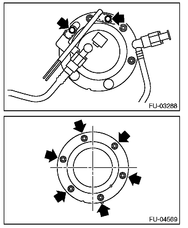 9. Remove the bolts and nuts which secure fuel sub level sensor protector and fuel sub level sensor upper plate to the fuel tank.