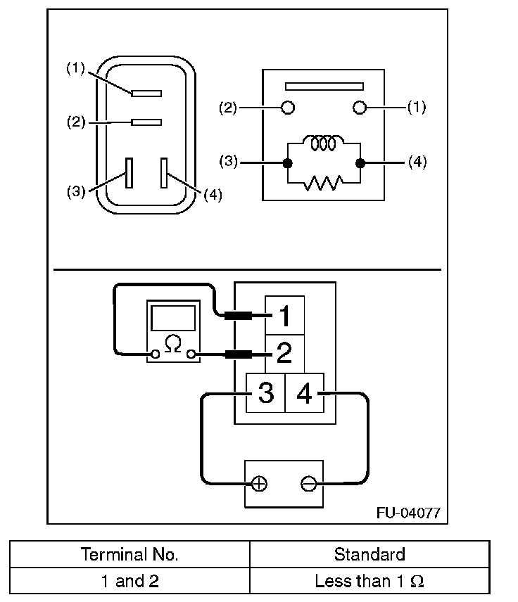 3. Connect battery positive terminal to terminal No. 3 and battery ground terminal to terminal No. 4, and measure the resistance between the main relay terminals.