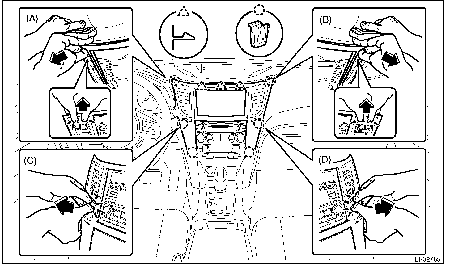 3. Insert a finger into the air vent grille and release the left and right clips at the center of the center panel. (C), (D)