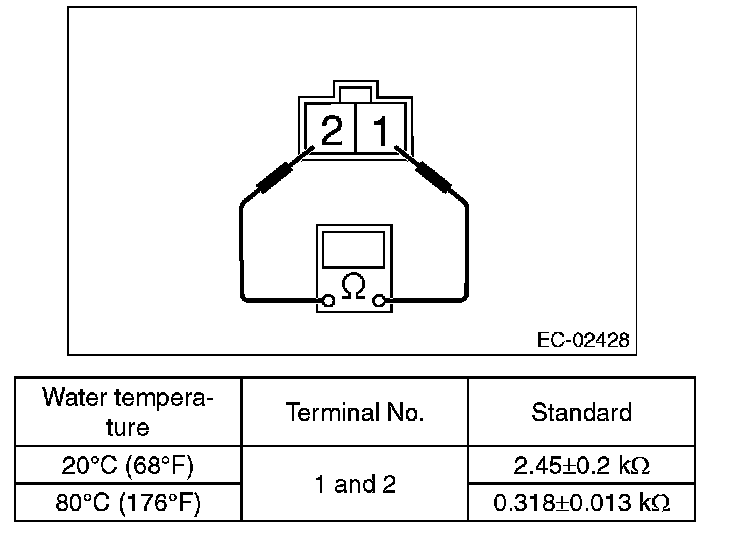3. Raise water temperature gradually, measure the resistance between the engine coolant temperature sensor terminals when the temperature is 20 °C (68 °F) and 80° C (176 °F).