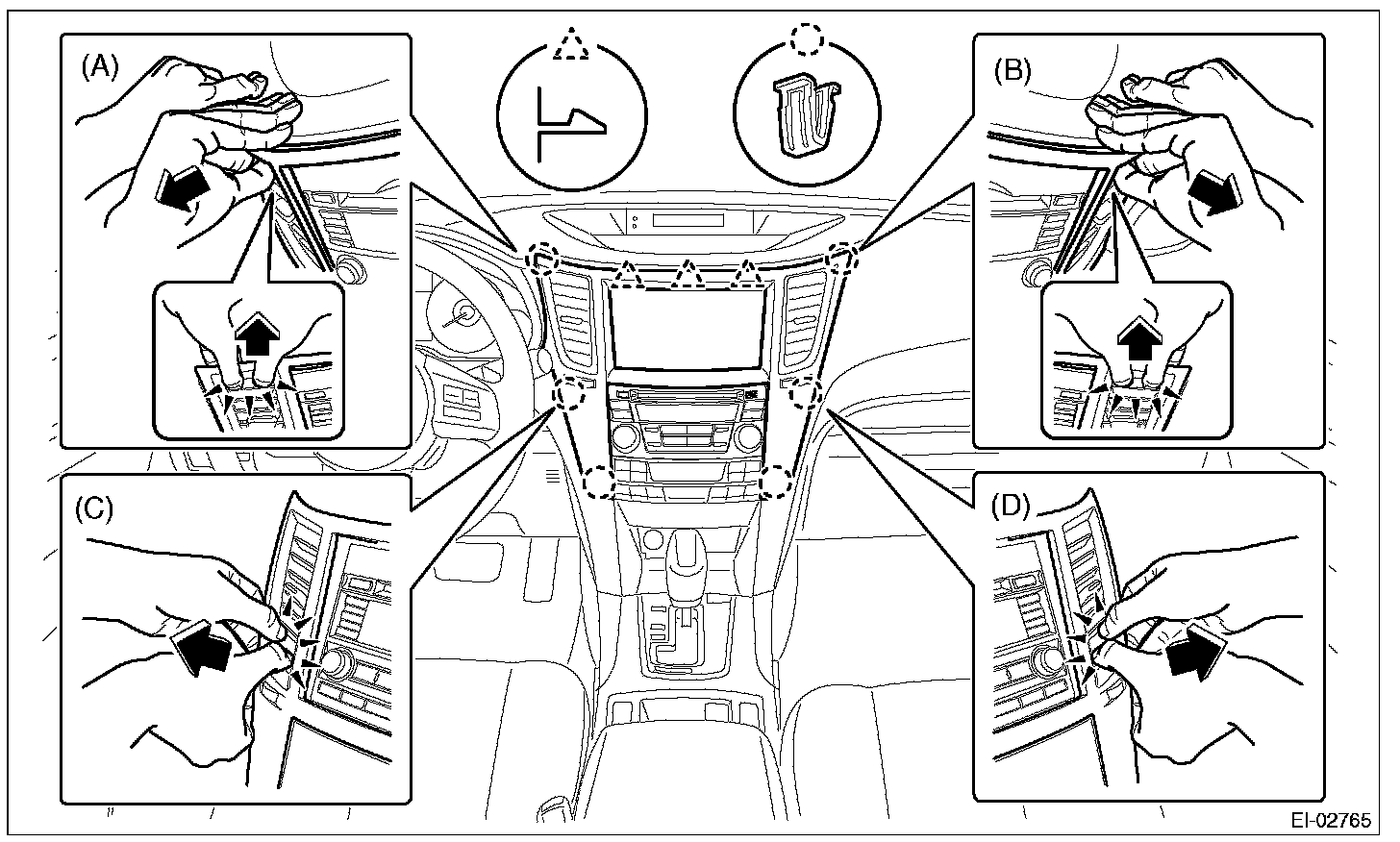 3. Insert a finger into the air vent grille and release the left and right clips at the center of the center panel. (C), (D)