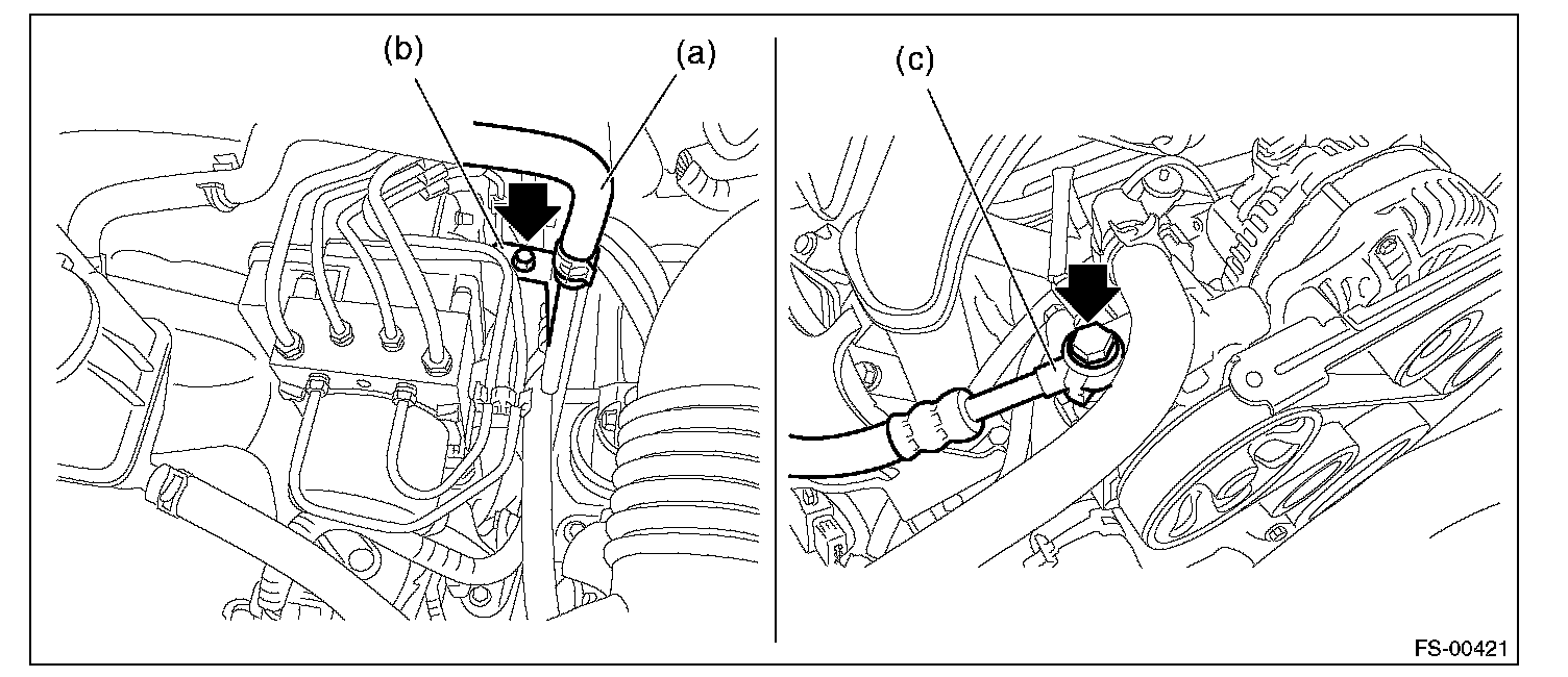 (3) Remove the bolt, and disconnect the hose (c) from the power steering pump.