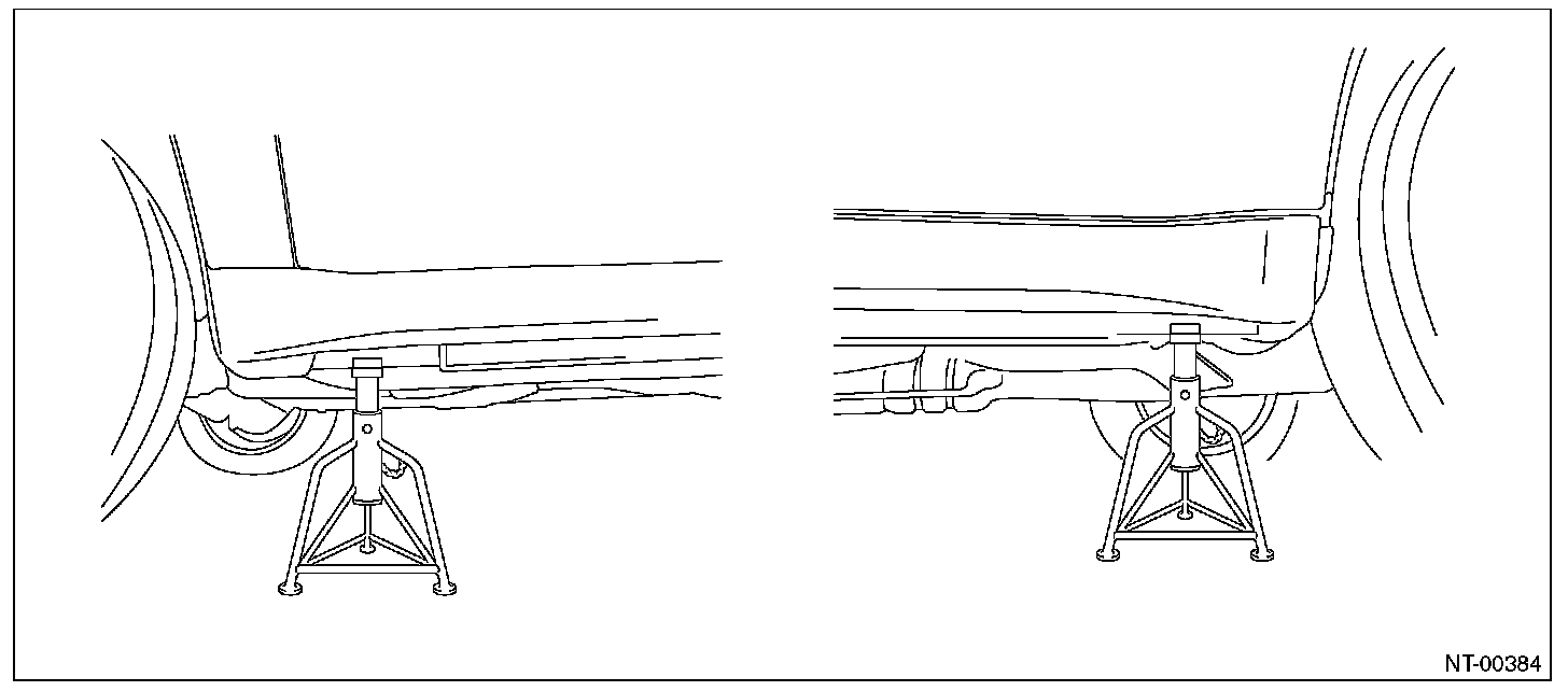2. Jack up the rear wheels and set the rigid racks to the specified locations of side sill.