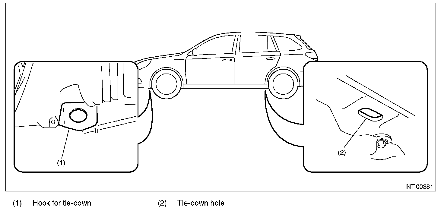 CAUTION: When the vehicle is tied down from vehicle inside, hook the hooks of tie-down chain on the rear tie-down hooks from vehicle inside. When the vehicle is tied down from vehicle outside, hook the hooks of tie-down chain on the rear tie-down hooks from vehicle outside.