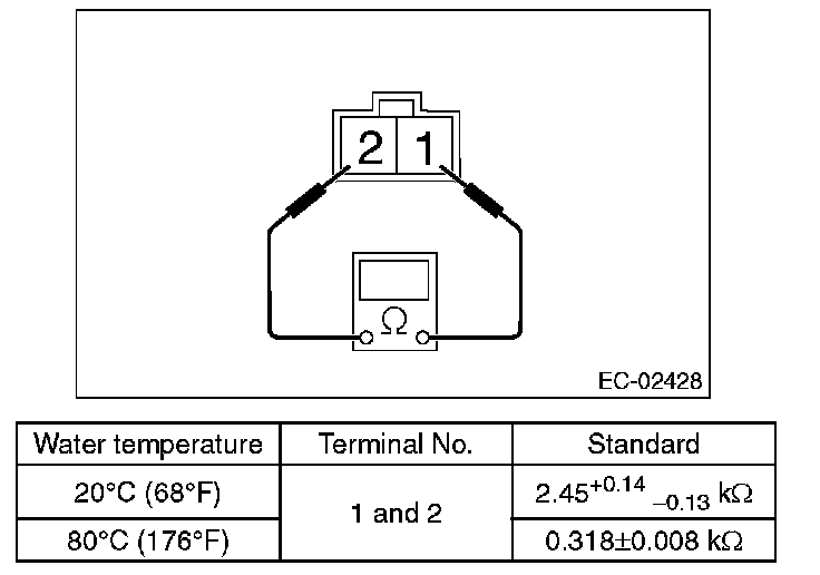 3. Raise water temperature gradually, measure the resistance between the engine coolant temperature sensor terminals when the temperature is 20 °C (68 °F) and 80 °C (176 °F).