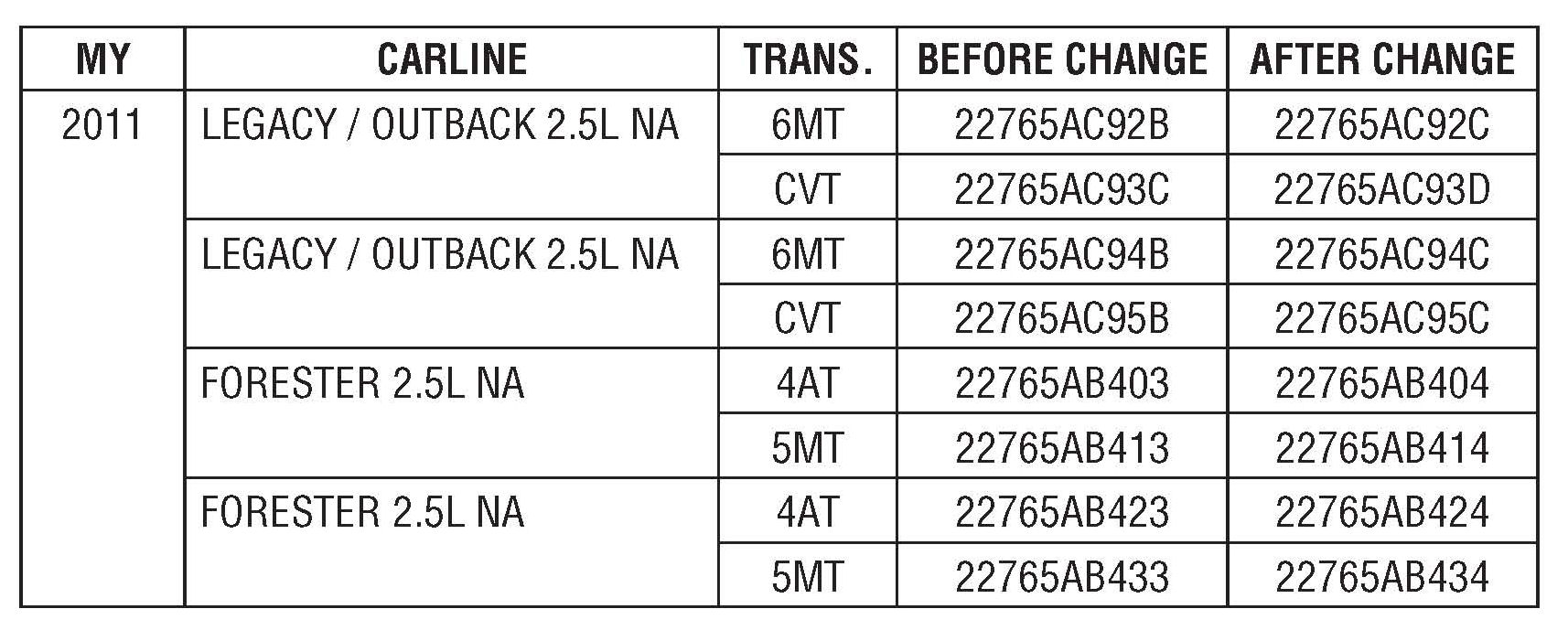 With the release of the October 2011 Subaru Select Monitor III (SSMIII) software update and Flash Write reprogramming software updates, a new logic revision was added for the above listed models. "Improvement of Engine Speed Stability" and "Program for Unification of Engine Speed Stability" is designed to homogenize across all model lines an update previously incorporated in other models. The purpose of this change is to improve the engine speed stability under idling conditions when the transmission gear shift position is changed from "N" to "D". Under normal conditions, when the transmission gear shift position is changed from "N" to "D" the target engine speed is changed just after the transmission clutch is engaged. However, in cases where the catalyst warmed-up signal is input to the ECM during the delay time (i.e timing between gear position signal is changed and transmission clutch is engaged), the target engine speed does not change as desired To improve this condition, the target engine speed calculation procedure has been modified. Though this change affects only automatic transmission models, the ECU of manual transmission models have also changed in order to homogenize the ECU programming logic across all models. This calibration change is designed to have no effect on emissions or fuel economy.
