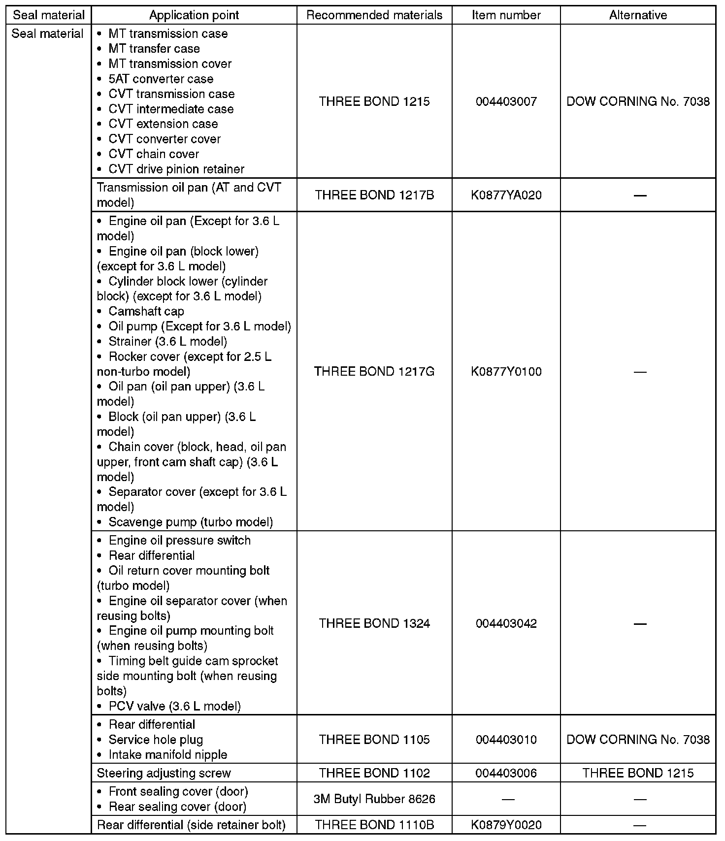 Use the seal material shown in the table below, or equivalent.
