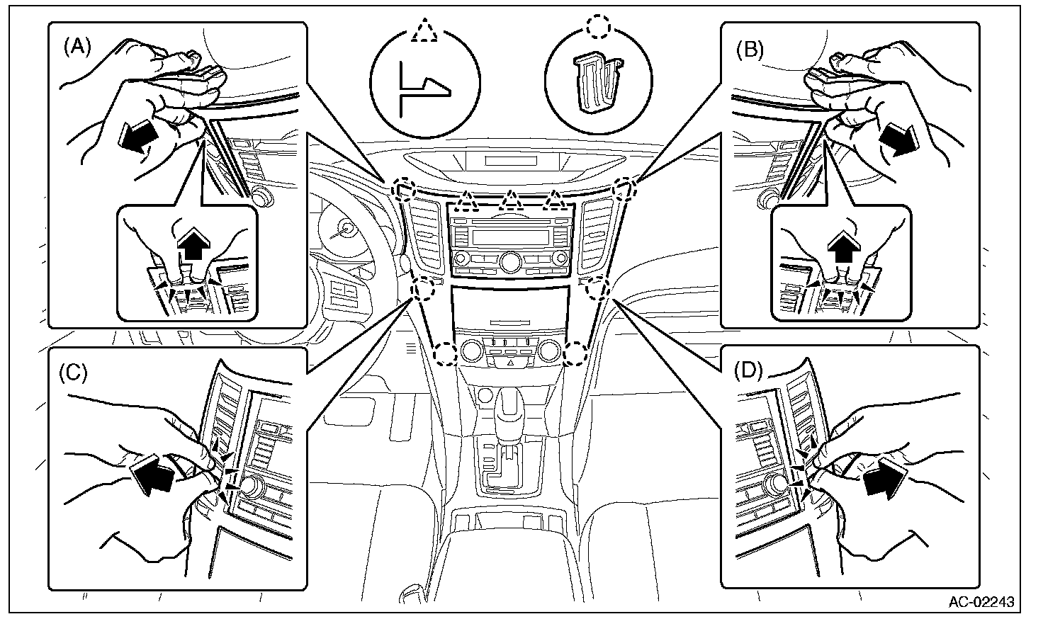 3. Insert a finger into the air vent grille and release the left and right clips at the center of the center panel. (C), (D)