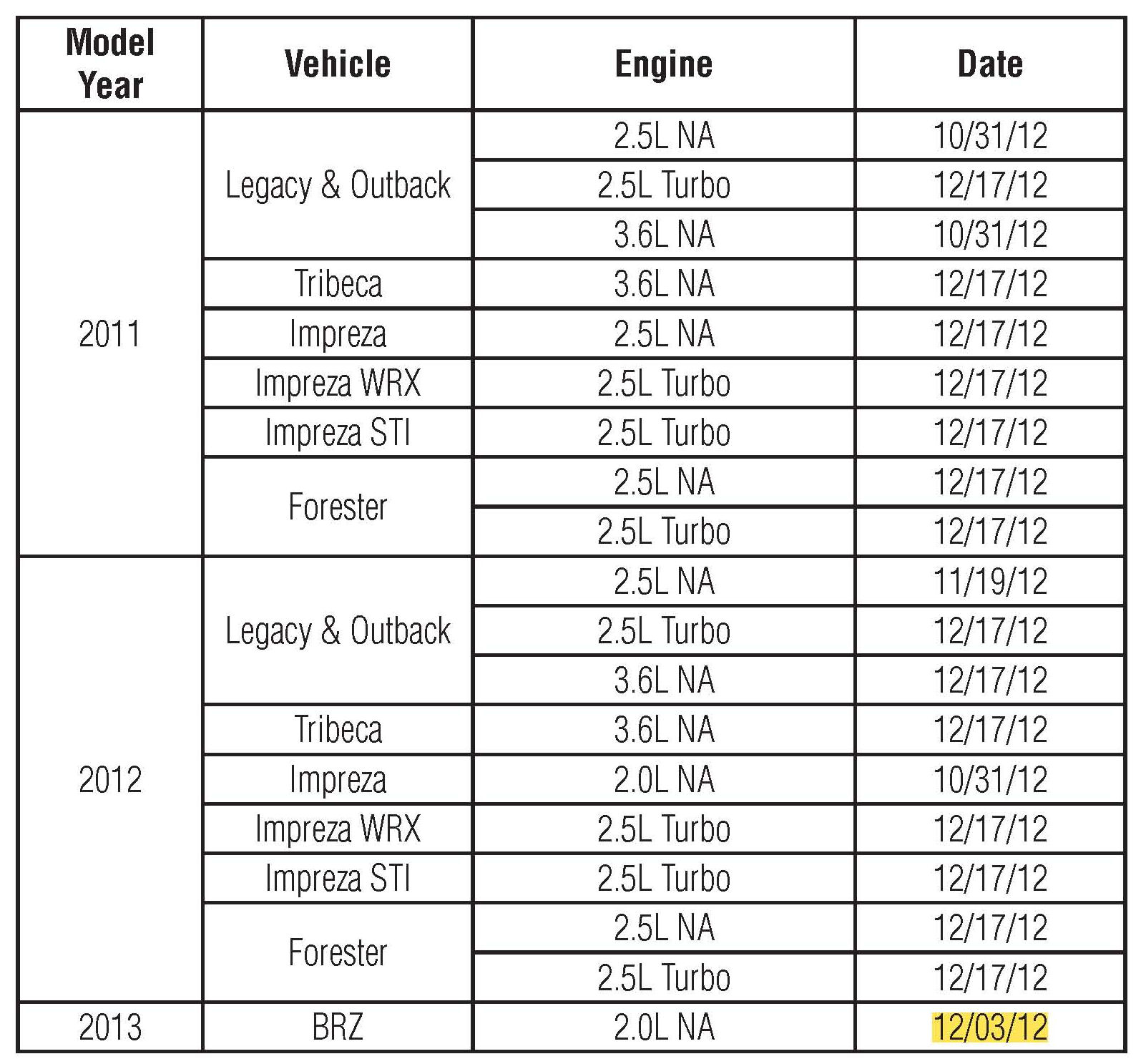 Affected vehicles are identified in the VIN range chart. NOTE: Not all vehicles in the VIN ranges are affected. Prior to performing repairs, confirm coverage by using the Vehicle Coverage Inquiry function at Subarunet.com.