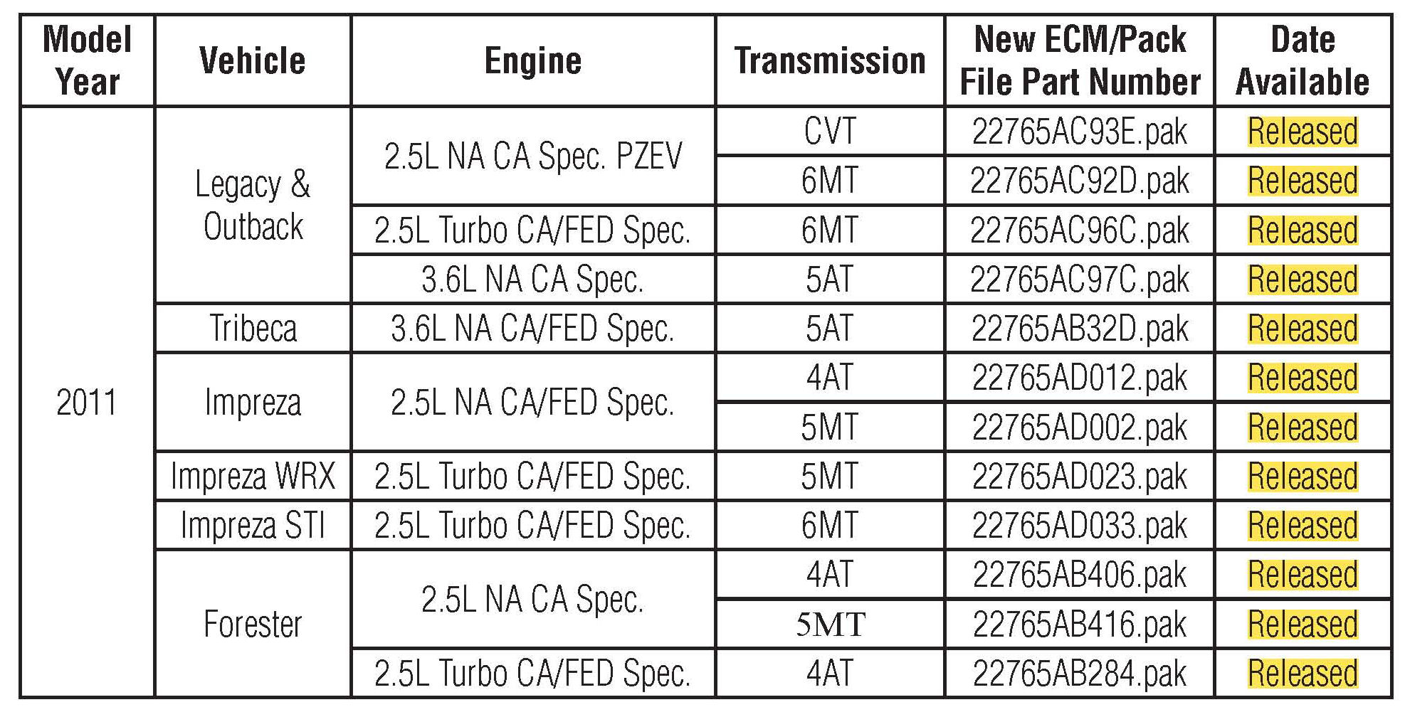 Subaru of America, Inc. has determined that vehicles affected by this Service Program require ECM reprogramming.