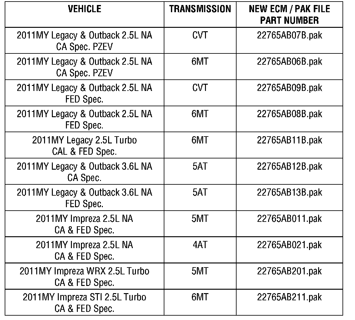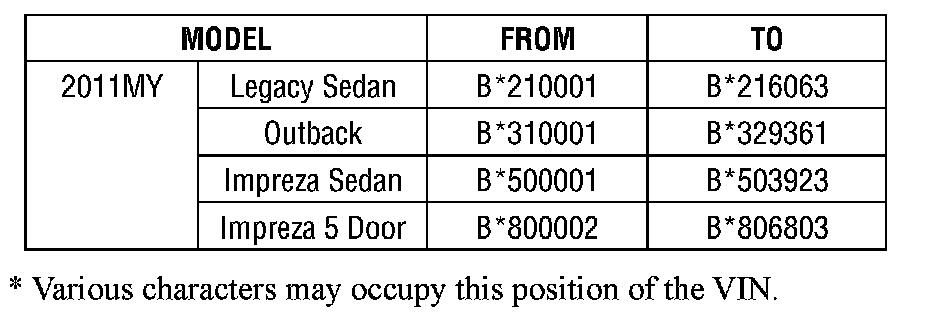 APPLICABILITY: 2011 MY Legacy, Outback & Impreza