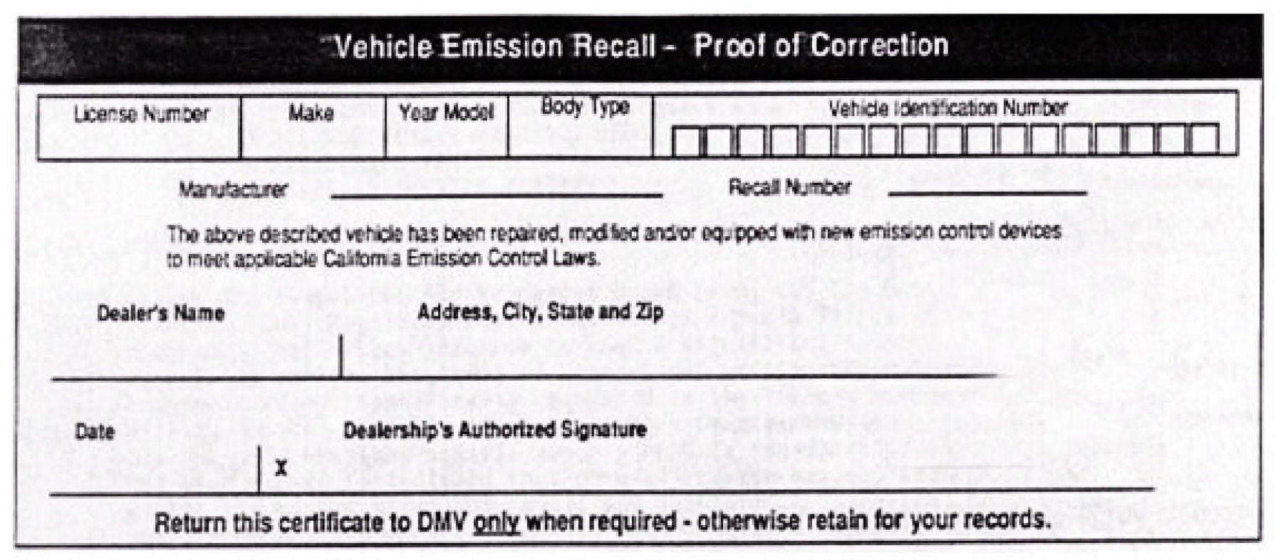 CALIFORNIA "VEHICLE EMISSION RECALL - PROOF OF CORRECTION" CERTIFICATE
