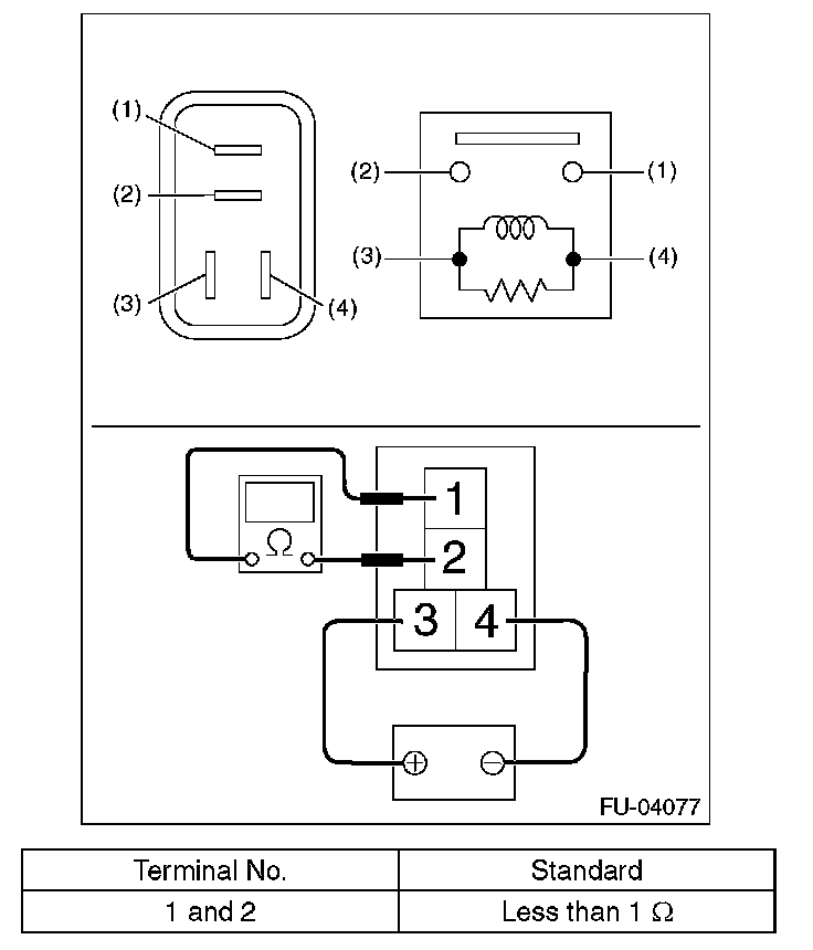3. Connect battery positive terminal to terminal No. 3 and battery ground terminal to terminal No. 4, and measure the resistance between the main relay terminals.