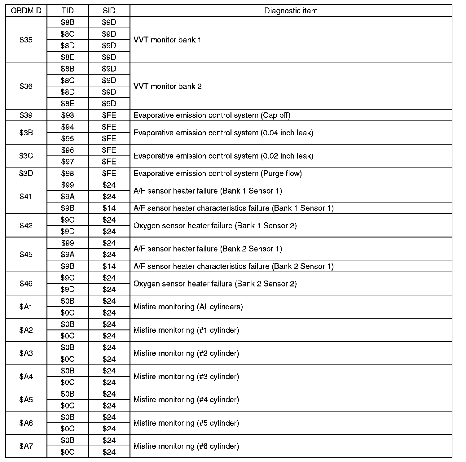 A list of the support data and PID (Parameter Identification) codes are shown in the following table.