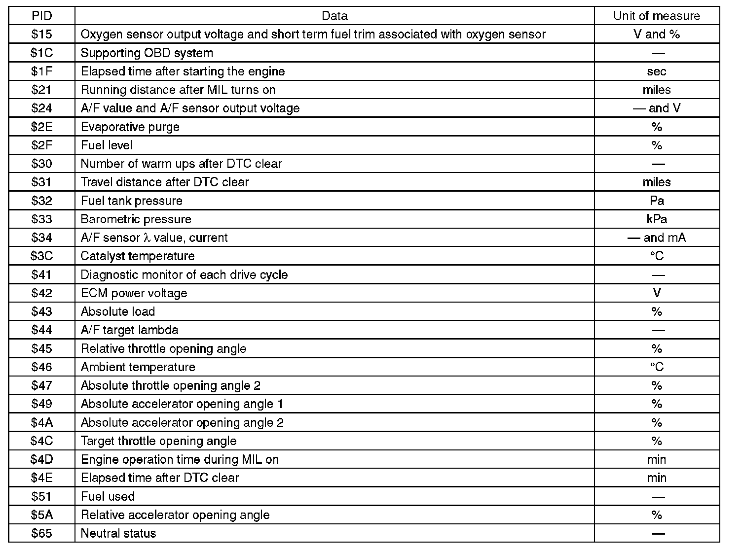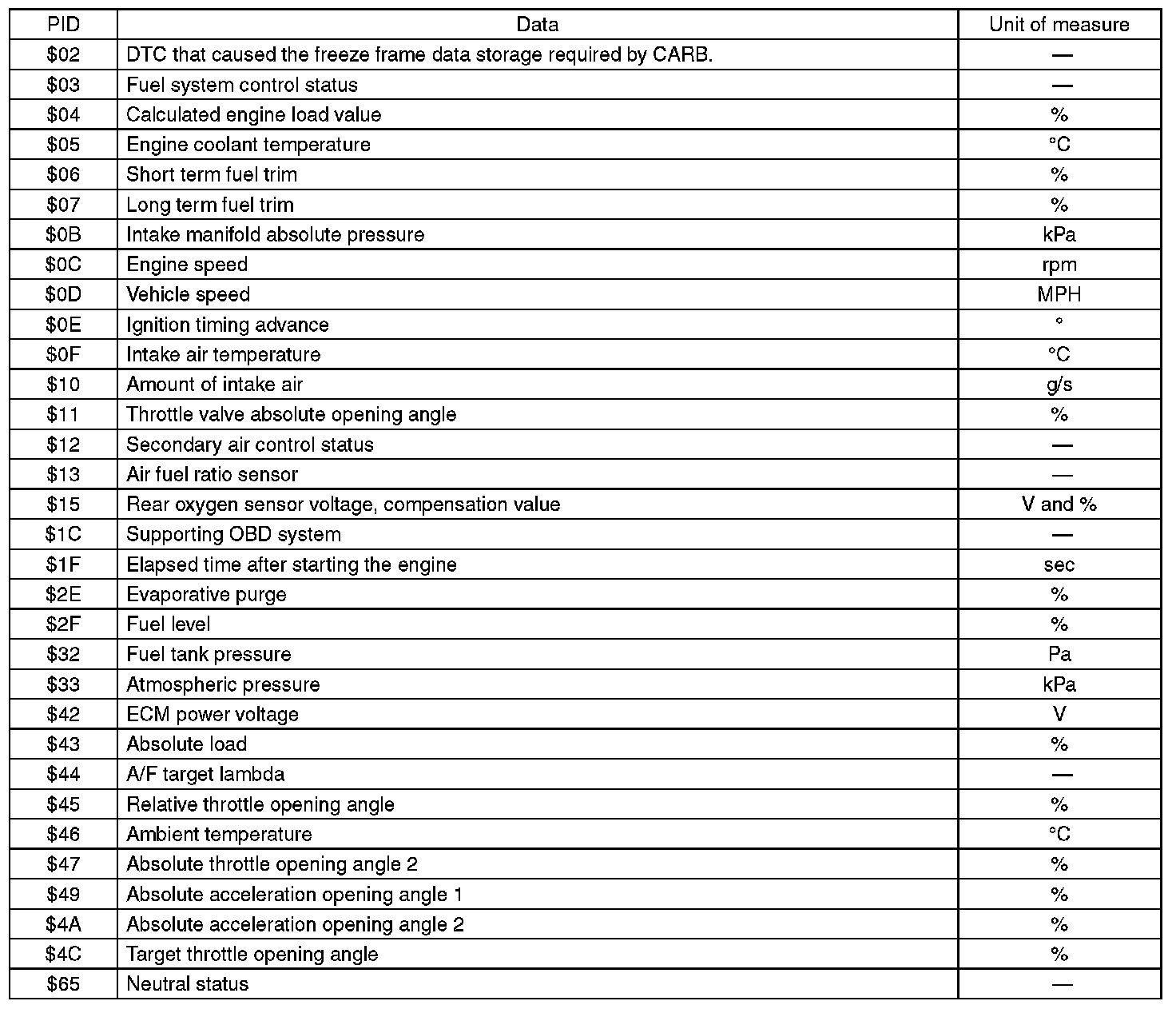 A list of the support data and PID (Parameter Identification) codes are shown in the following table.