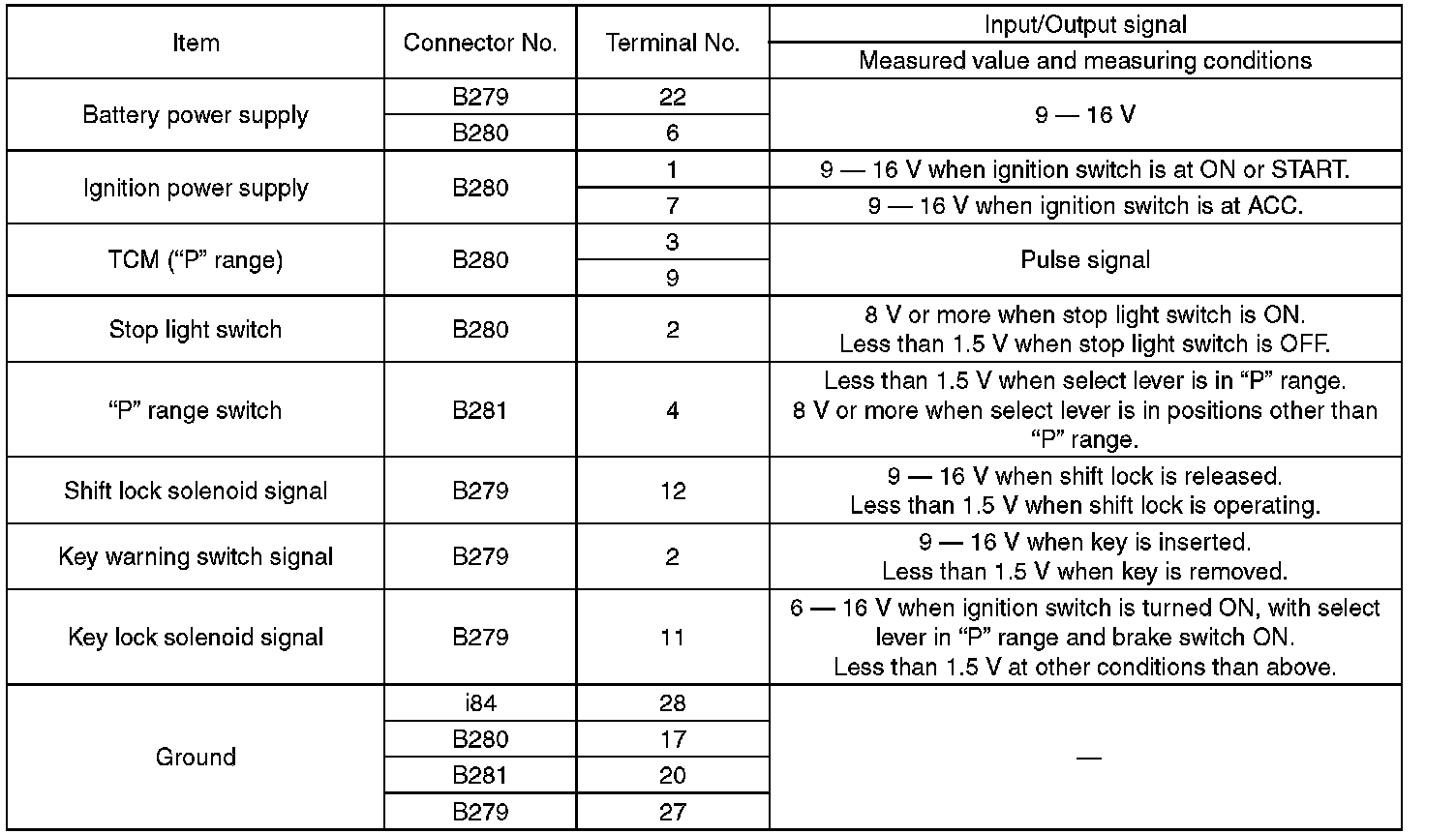 Pinout Values and Diagnostic Parameters