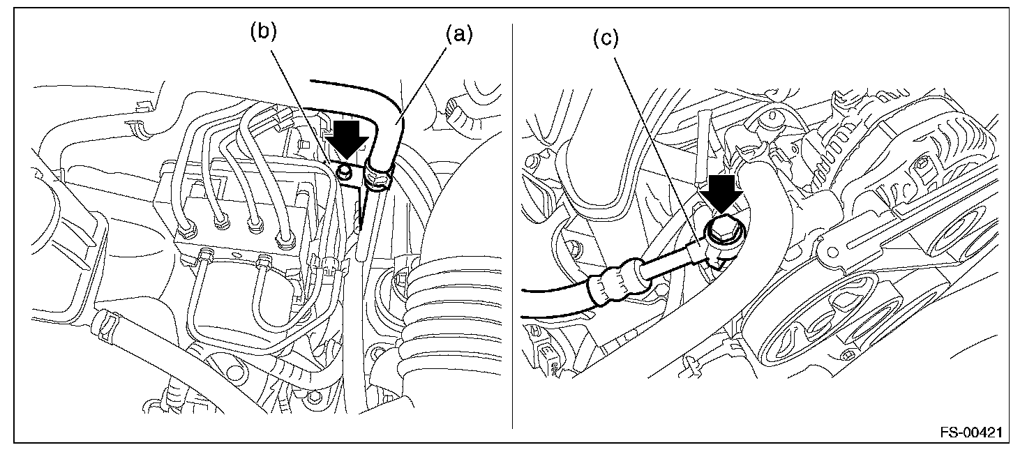 (3) Remove the bolt, and disconnect the hose (c) from the power steering pump.