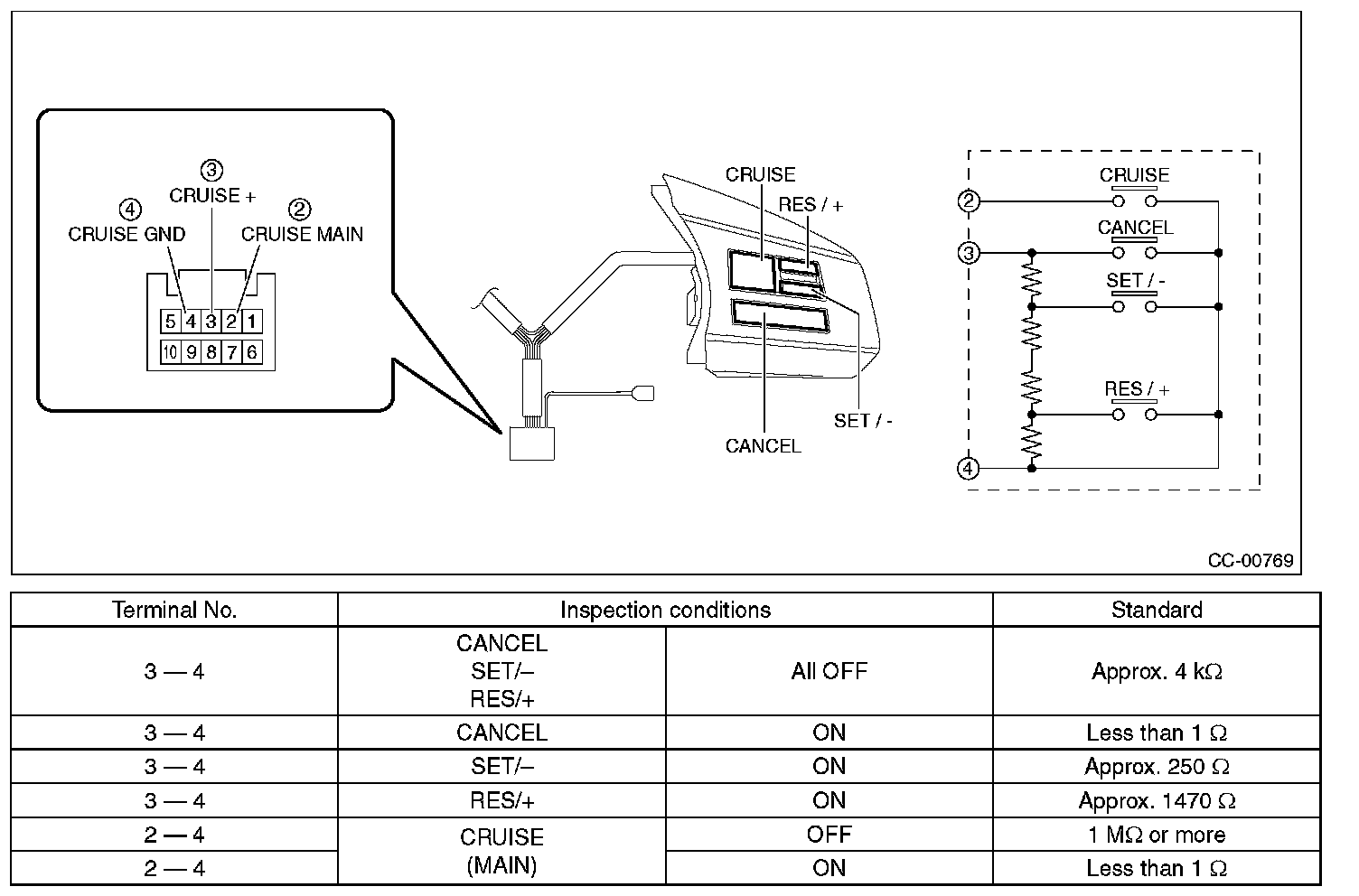 2. Check the resistance between cruise control command switch terminals.