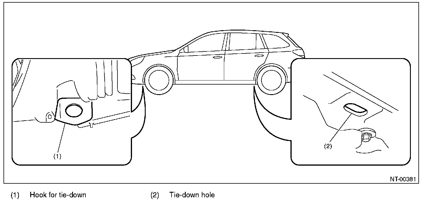 CAUTION: When the vehicle is tied down from vehicle inside, hook the hooks of tie-down chain on the rear tiedown hooks from vehicle inside. When the vehicle is tied down from vehicle outside, hook the hooks of tie-down chain on the rear tie-down hooks from vehicle outside.