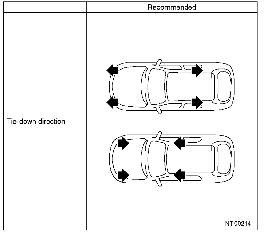 CAUTION: Fix the vehicle using a pulling metal (chain or wire) to the front and rear towing hooks or tiedown hook to prevent the lateral runout of front wheels and springing out of vehicle.