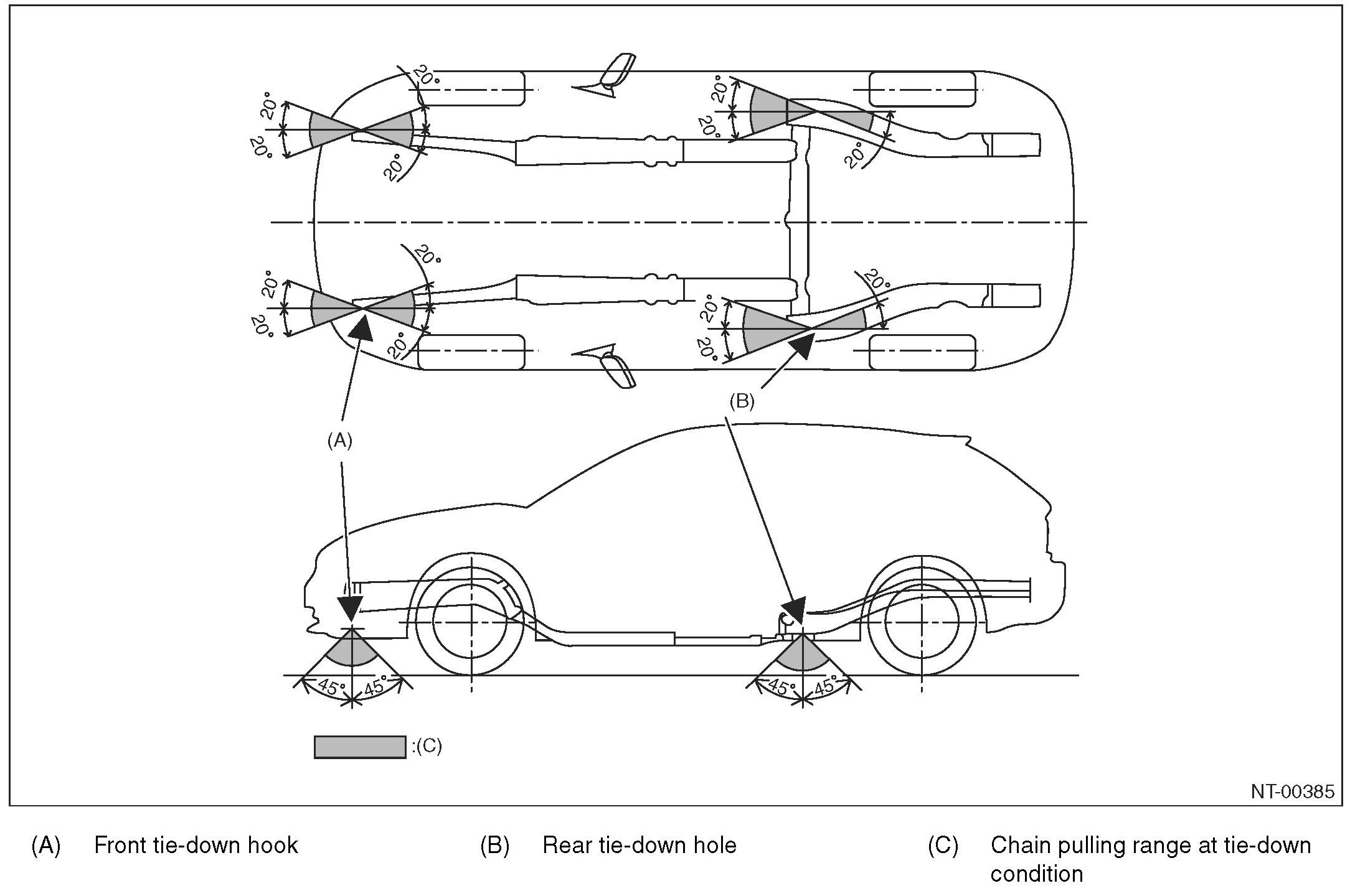 - Tie-down procedure should be followed as much as reasonably possible depending on the deck condition, however, lashing belt and vehicle must not contact each other. Also, if a wheel tie-down is conducted instead of using rear tie-down hole due to the vehicle loading condition of the deck, follow the instructions below.