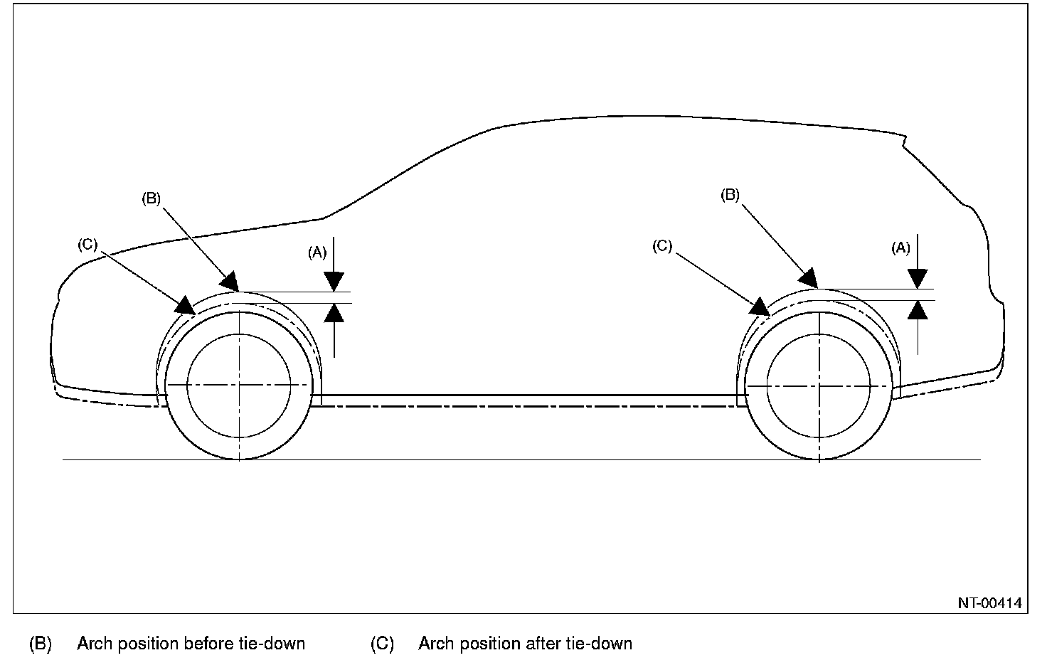 2. After tie-down, measure the distance between the highest tire point and highest arch point at the center of wheel.