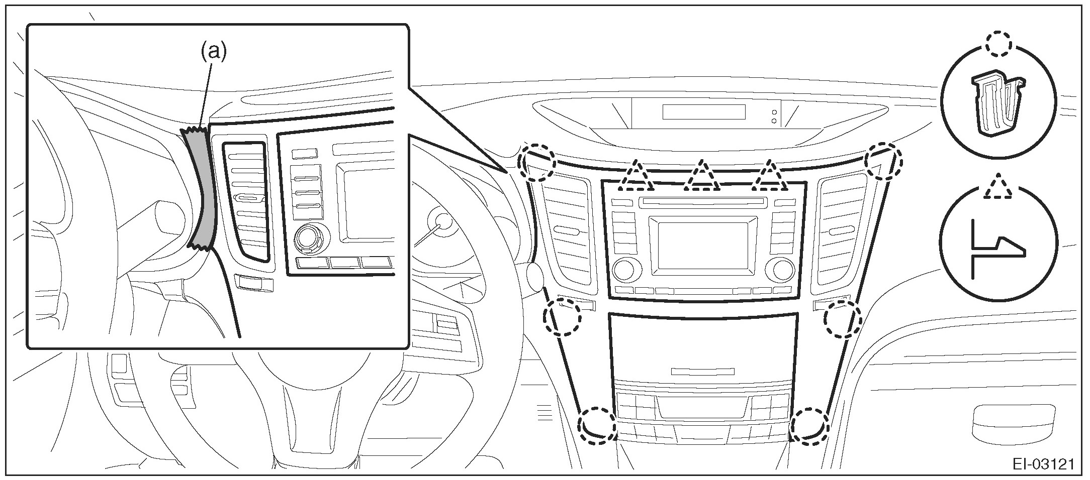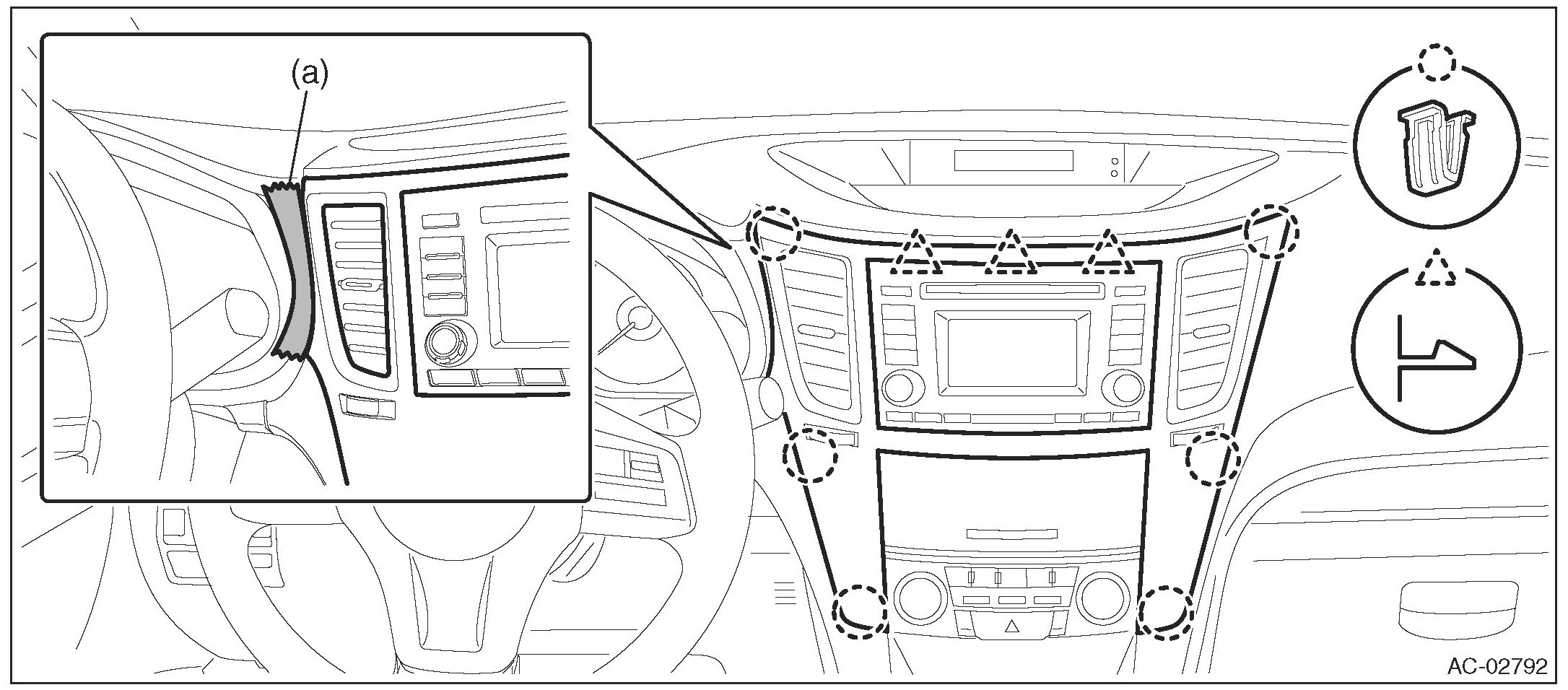 2. Insert a finger into the air vent grille and release the left and right clips at the top of the center panel. (A), (B)