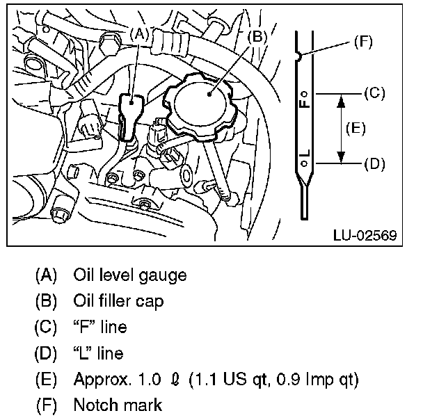 11) After stopping the engine, recheck the oil level. If necessary, add engine oil up to the "F" line on oil level gauge.