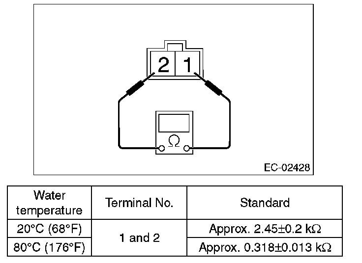 3. Raise water temperature gradually, measure the resistance between the engine coolant temperature sensor terminals when the temperature is 20 °C (68 °F) and 80 °C (176 °F).