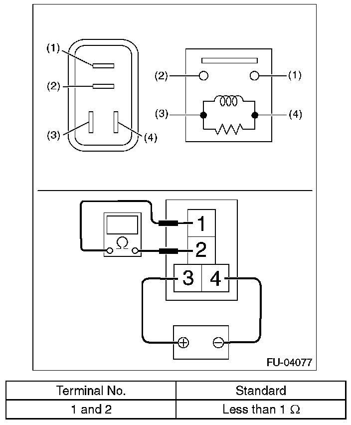 3. Connect battery positive terminal to terminal No. 3 and battery ground terminal to terminal No. 4, and measure the resistance between the main relay terminals.