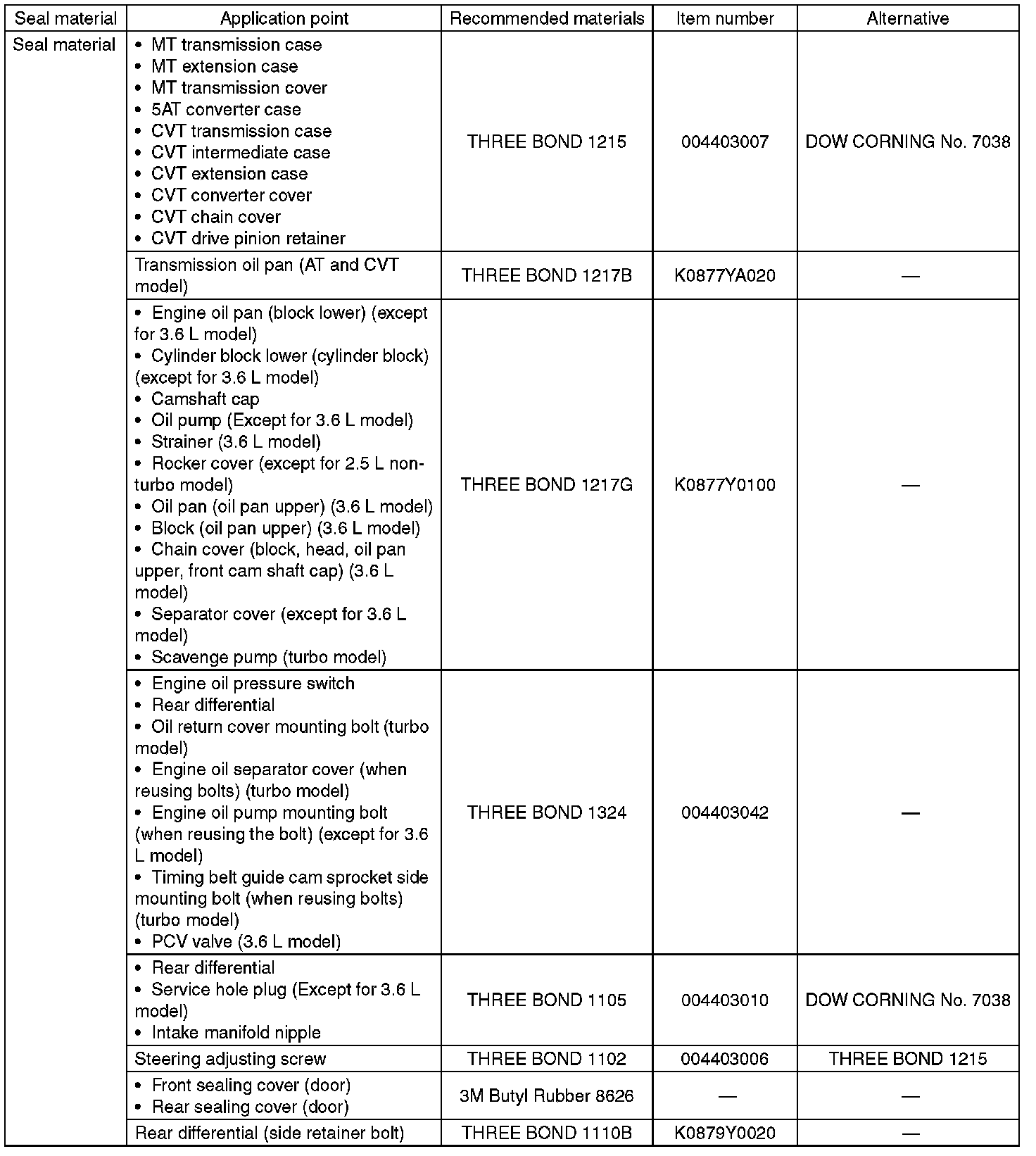 Use the seal material shown in the table below, or equivalent.