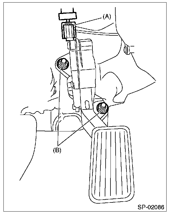 3. Remove the nut (B) securing accelerator pedal assembly and remove the accelerator pedal assembly.