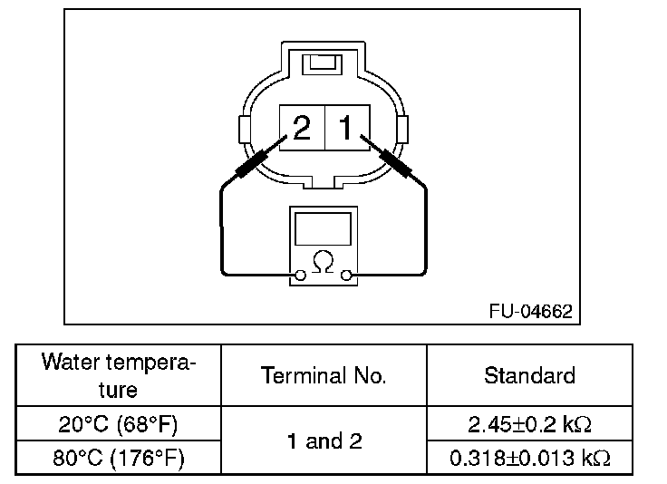 3. Raise water temperature gradually, measure the resistance between the engine coolant temperature sensor terminals when the temperature is 20 °C (68 °F) and 80 °C (176 °F).