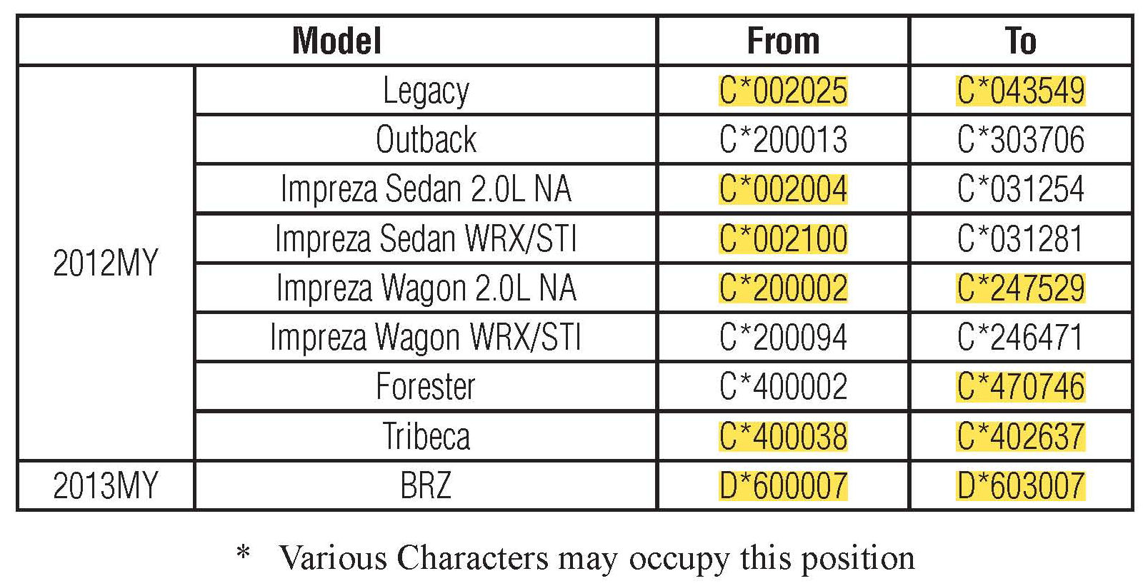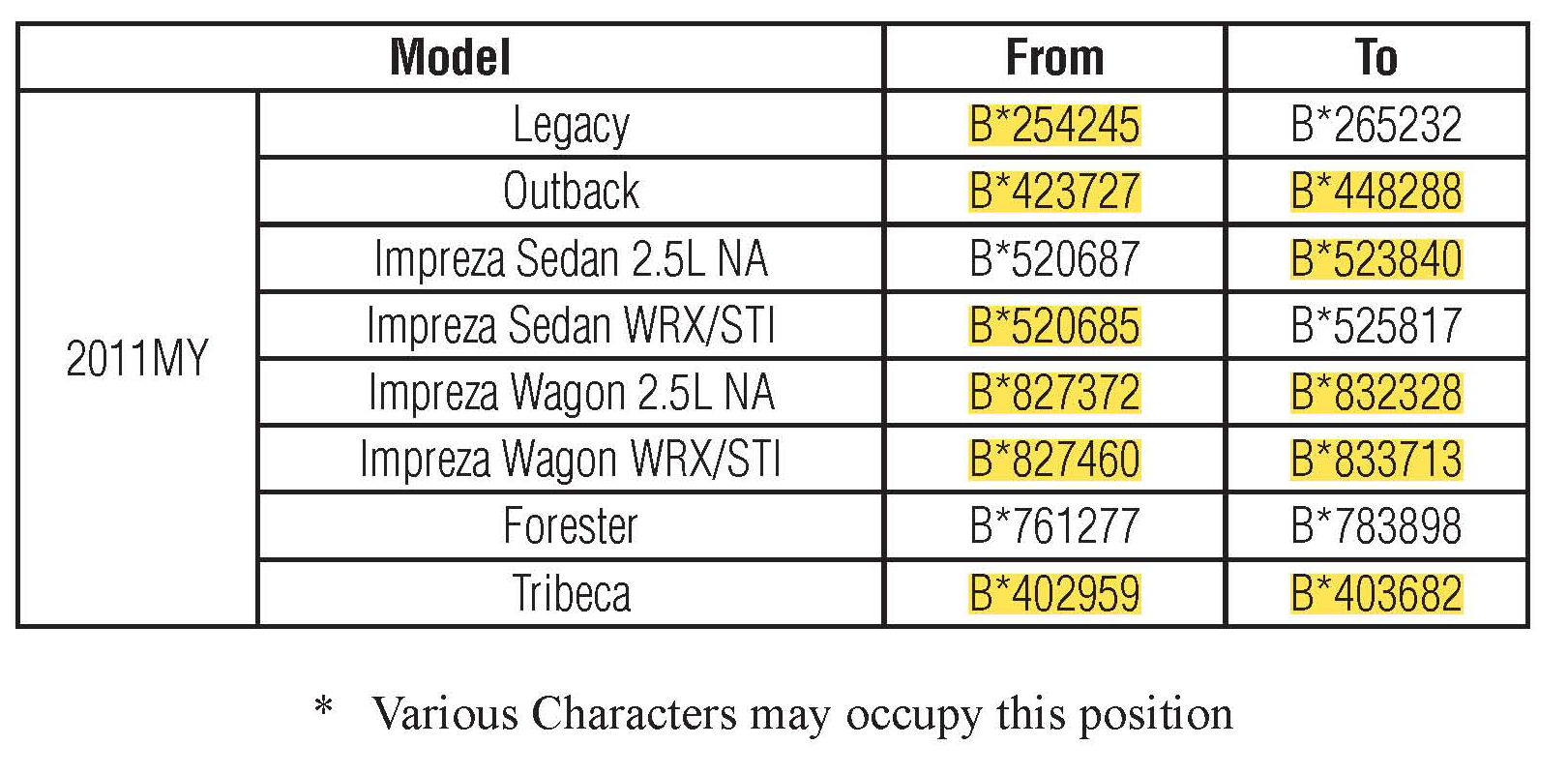 Affected vehicles are identified in the VIN range chart. NOTE: Not all vehicles in the VIN ranges are affected. Prior to performing repairs, confirm coverage by using the Vehicle Coverage Inquiry function at Subarunet.com.