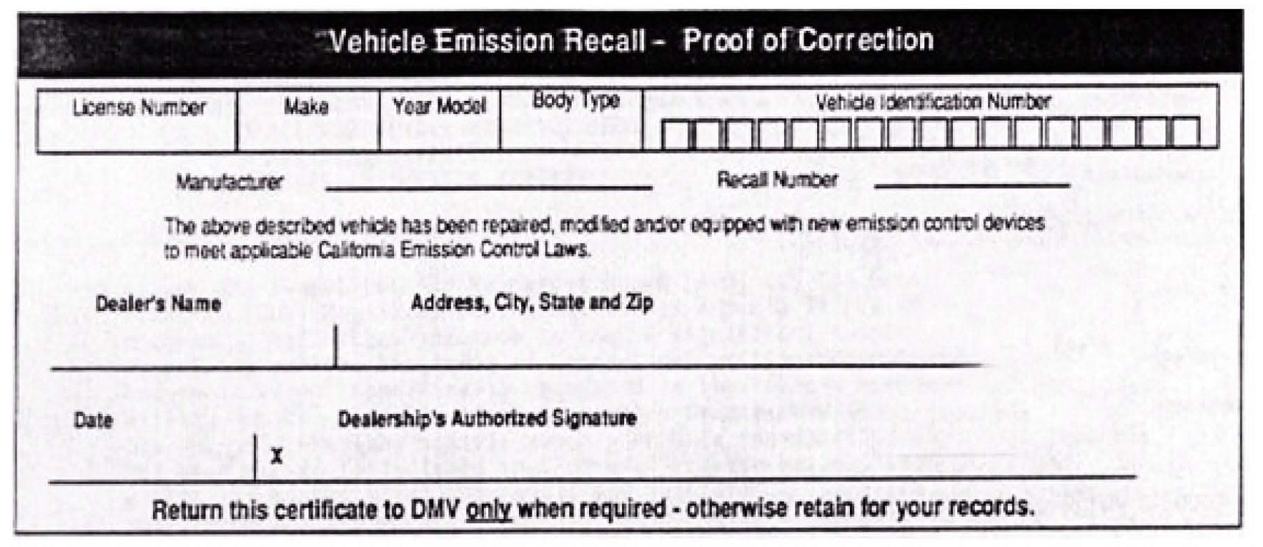 CALIFORNIA "VEHICLE EMISSION RECALL - PROOF OF CORRECTION" CERTIFICATE