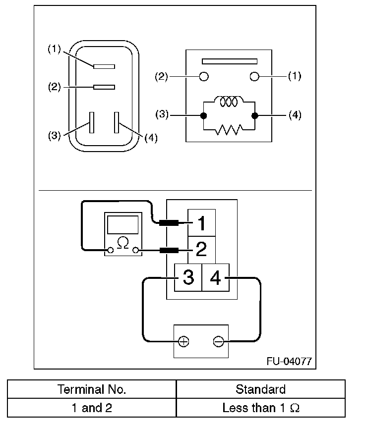 3. Connect battery positive terminal to terminal No. 3 and battery ground terminal to terminal No. 4, and measure the resistance between the main relay terminals.