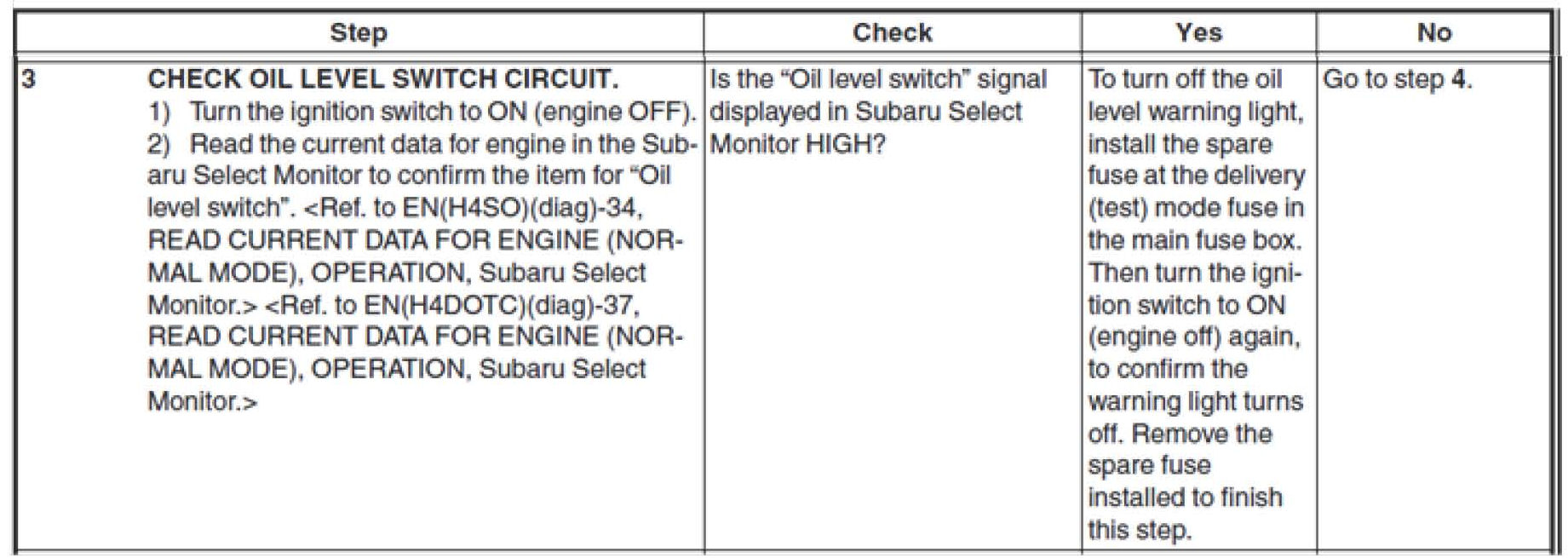 1) Clarification of the inspection method (trouble shooting) for the oil level warning light In the troubleshooting process as outlined in the service manual, the oil level switch only requires replacement when indicated after inspection steps 6 have been completed. If the oil level switch warning light goes off at Step 3, the oil level switch is normal and does not require replacement To clarify, the final cominent under "YES" for step 3 ("Remove the spare fuse installed to finish this step") is the end of the diagnostic process There is no need to proceed any further as the switch has been judged as operating properly.