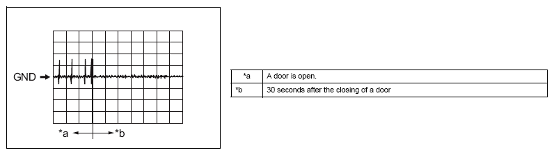 Item Contents Measuring terminal D6-11(L2) ↔ chassis ground Equipment setting 5 V/DIV., 20 ms/DIV. Measuring conditions IG OFF, all doors closed, driver's door locked Item Contents Measuring terminal D6-12(UL2) ↔ chassis ground Equipment setting 5 V/DIV., 20 ms/DIV. Measuring conditions IG OFF, all doors closed, passenger's door locked